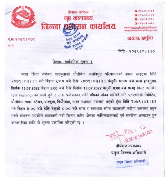भारतले आज बिहान ५ बजेदेखि बेलुका ८ बजेसम्म धौलीगङ्गा जलविद्युत् आयोजनाको नहर सफाइ गर्न बाँध खोल्दा महाकाली नदीको बहाव बढ्ने भएकाले दिनभर नै सतर्क रहन जिल्ला प्रशासन कार्यालय दार्चुलाले आग्रह गरेको छ ।