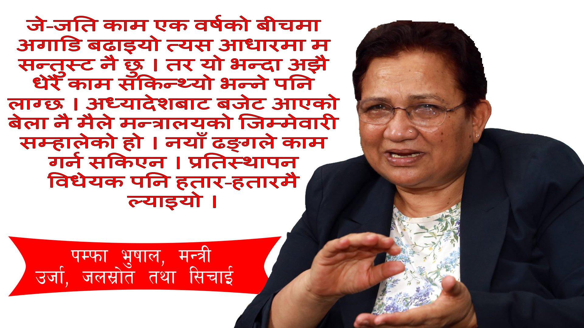 जे–जति काम एक वर्षको बीचमा अगाडि बढाइयो त्यस आधारमा म सन्तुस्ट नै छु । तर यो भन्दा अझै धेरै काम सकिन्थ्यो भन्ने पनि लाग्छ । अध्यादेशबाट बजेट आएको बेला नै मैले मन्त्रालयको जिम्मेवारी सम्हालेको हो । नयाँ ढङ्गले काम गर्न सकिएन । प्रतिस्थापन विधेयक पनि हतार–हतारमै ल्याइयो । हाम्रो लामो प्रशासनिक प्रक्रिया छन्, त्यसको पनि प्रभाव पर्यो नै । हामी पनि राजनीतिक मानिस भएकाले राजनीतिक काममा पनि केही समय दिइयो होला । स्थानीय निर्वाचनले पनि केही समय काम प्रभावित भयो ।