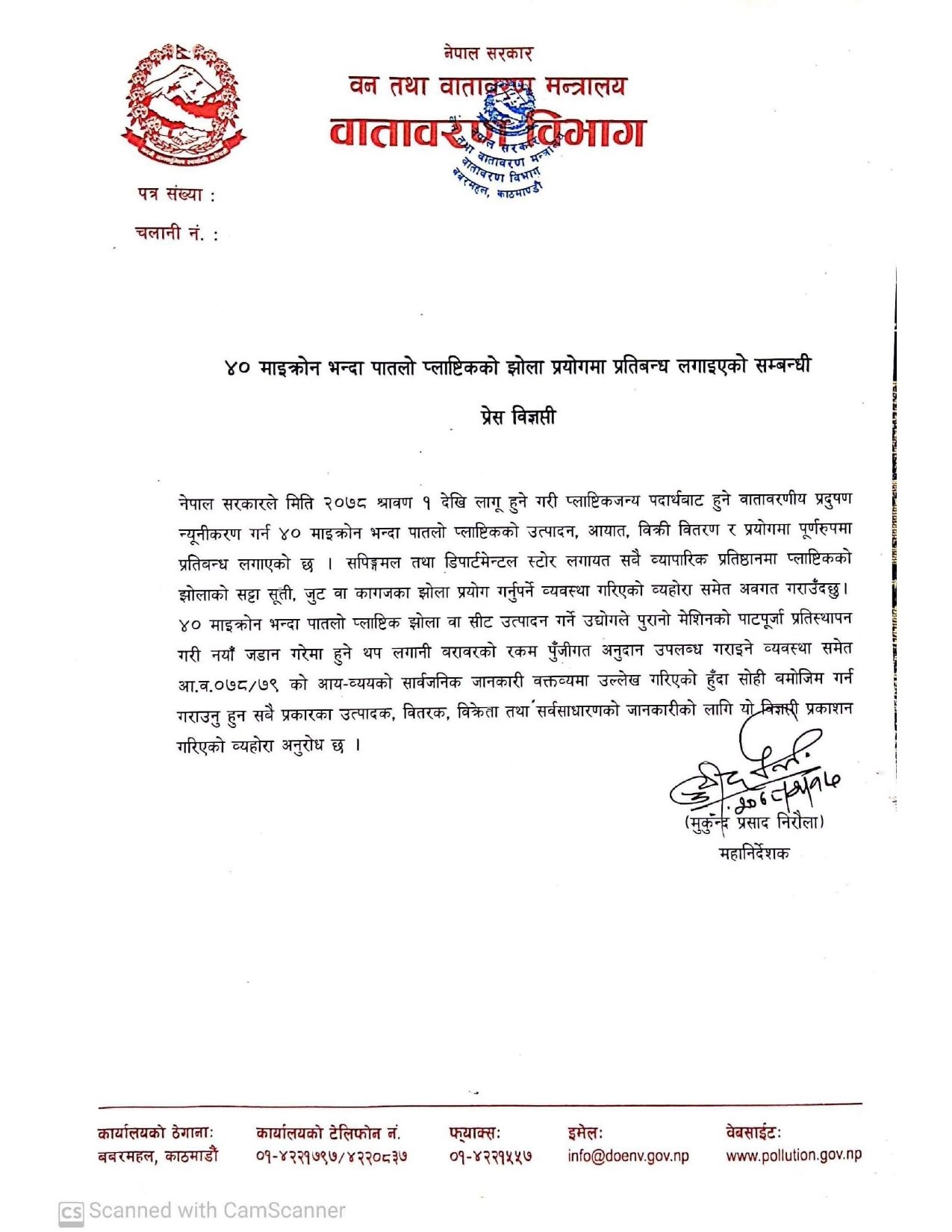 वन तथा वातावरण मन्त्रालय, वातावरण विभागले सूचना निकालेर ४० माइक्रोनभन्दा पातलो प्लास्टिक झोलाको प्रयोग नगर्न आग्रह गरेको छ ।