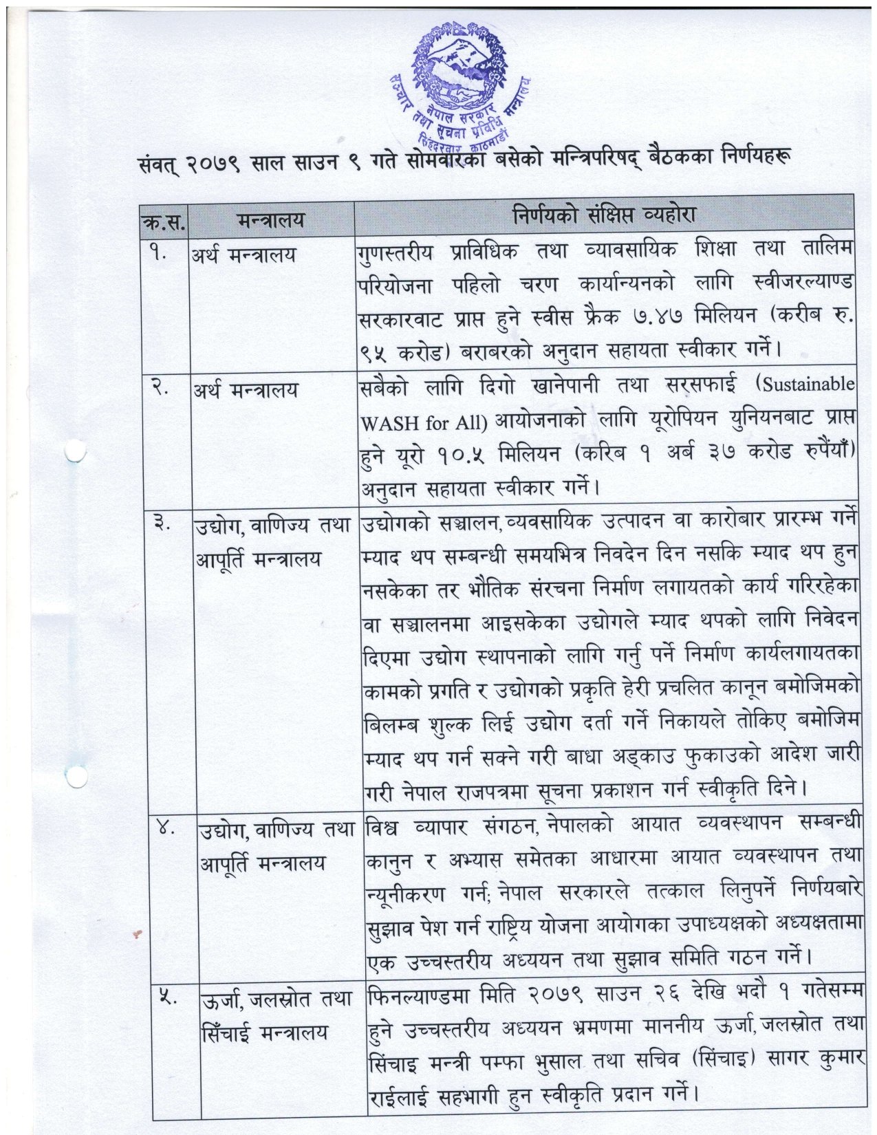 मन्त्रिपरिषद् बैठकका १२ निर्णय (सूचीसहित) उपहार खबर प्रकाशित मिति : १० श्रावण २०७९, मंगलवार १८:१५July 26, 2022