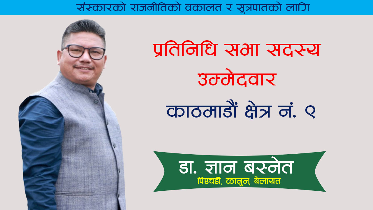 डा.ज्ञान बस्नेतले प्रतिनिधि सभा सदस्यमा काठमाण्डौ क्षेत्र नं ९ बाट स्वतन्त्र उम्मेदवारी घोषणा गर्नु भएको छ । संस्कारको राजनीतिको वकालत र सुत्रपातको तथा राष्ट्रिय स्वाधिनाताको रक्षा र वकातलको लागि उम्मेदवारी दिन लागेको उहाँले बताउनुभयो । यसैगरी युवाहरुलाई राजनीतिमा आकर्षण गर्न, राजनीतिलाई सर्वसाधारण जनतासंग जोड्न, दण्डहिनता, कुशासन, भ्रष्ट्रचार, हरेक खालको अन्याय र अत्याचारको बिरुद्द उम्मेदवारी अघि सारेको समेत उहाँले बताउनुभएको छ । उहाँले भन्नुभयो “यो उम्मेदवारी दलीय प्रणालीको बिरुद्दमा पटक्कै हैन्, तर हाम्रोमा दलीयतन्त्रले उत्पादन गरेको भयावह राजनीतिक बिकृती र भागबण्डाको राजनितिको बिरुद्दमा छ।”