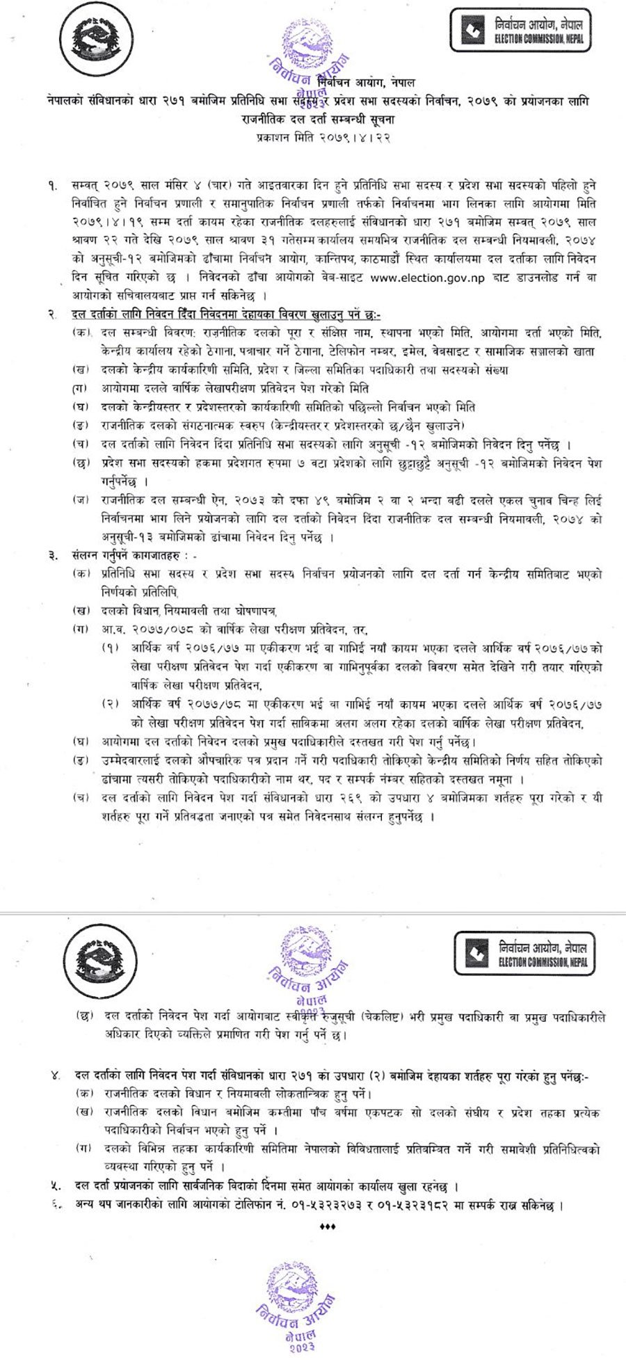 आयोगमा २०७९ साउन १९ सम्म दर्ता कायम भएका राजनीतिक दलहरु प्रत्यक्ष र समानुपातिक तर्फको निर्वाचन प्रयोजनका लागि दर्ता हुन पाउने छन् । दल दर्ता गर्न काठमाडौंको कान्तिपथस्थित निर्वाचन आयोगको कार्यालयमा कार्यालय समयभित्र जानुपर्ने छ ।
