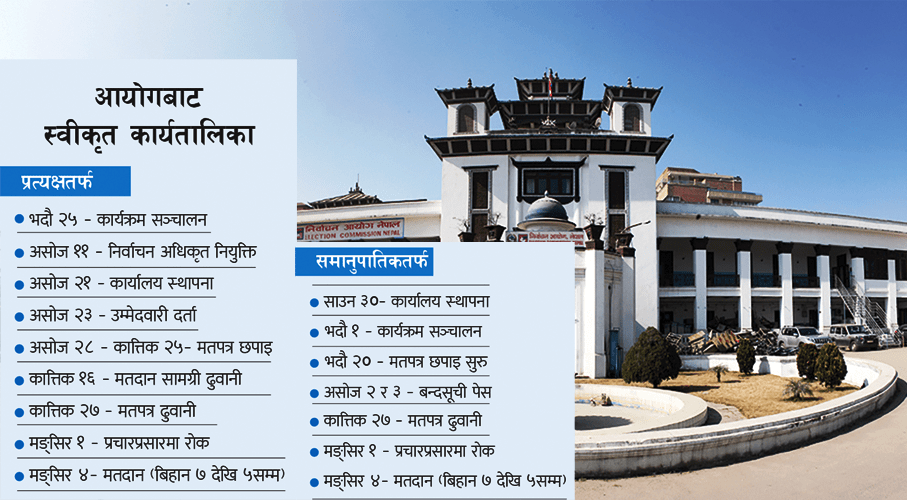 प्रमुख आयुक्त दिनेशकुमार थपलियाले आगामी प्रतिनिधि सभा तथा प्रदेश सभा सदस्य निर्वाचन व्यवस्थापनका लागि आयोगले आइतबार निर्वाचन कार्यतालिका स्वीकृत गरेको जानकारी दिए । उनले भने, “आयोगले उक्त तालिका पछ्याउँदै निर्वाचन कार्यक्रम सञ्चालन गर्नेछ ।” आयोगको परामर्शमा सरकारले मङ्सिर ४ गते आम चुनाव हुने मिति घोषणा गरिसकेको छ ।