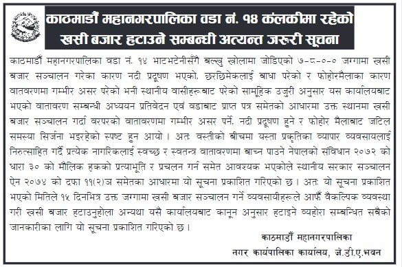 काठमाडौँ – काठमाडौं महानगरपालिकाले १५ दिनभित्र कलंकीमा रहेको खसी बजार हटाउन निर्देशन दिएको छ।