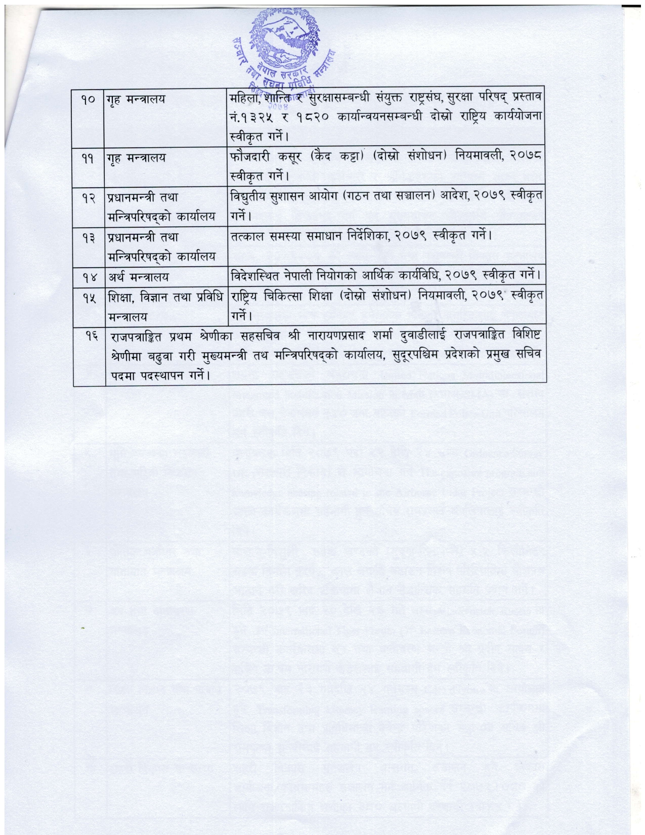 यस्तै मन्त्रिपरिषद बैठकले सहसचिव नारायणप्रसाद शर्मा दुवाडीलाई सचिवमा बढुवा गरी सुदूरपश्चिम प्रदेशको मुख्यमन्त्री तथा मन्त्रिपरिषद कार्यालयको प्रमुख सचिवमा पदस्थापन गर्ने निर्णय गरेको छ। मन्त्री कार्कीका अनुसार फौजदारी कसुर दोस्रो संशोधन नियमावली २०७८, विद्युती सुशासन आयोग गठन तथा संचालन आदेश २०७९ स्वीकृत गरेको छ ।