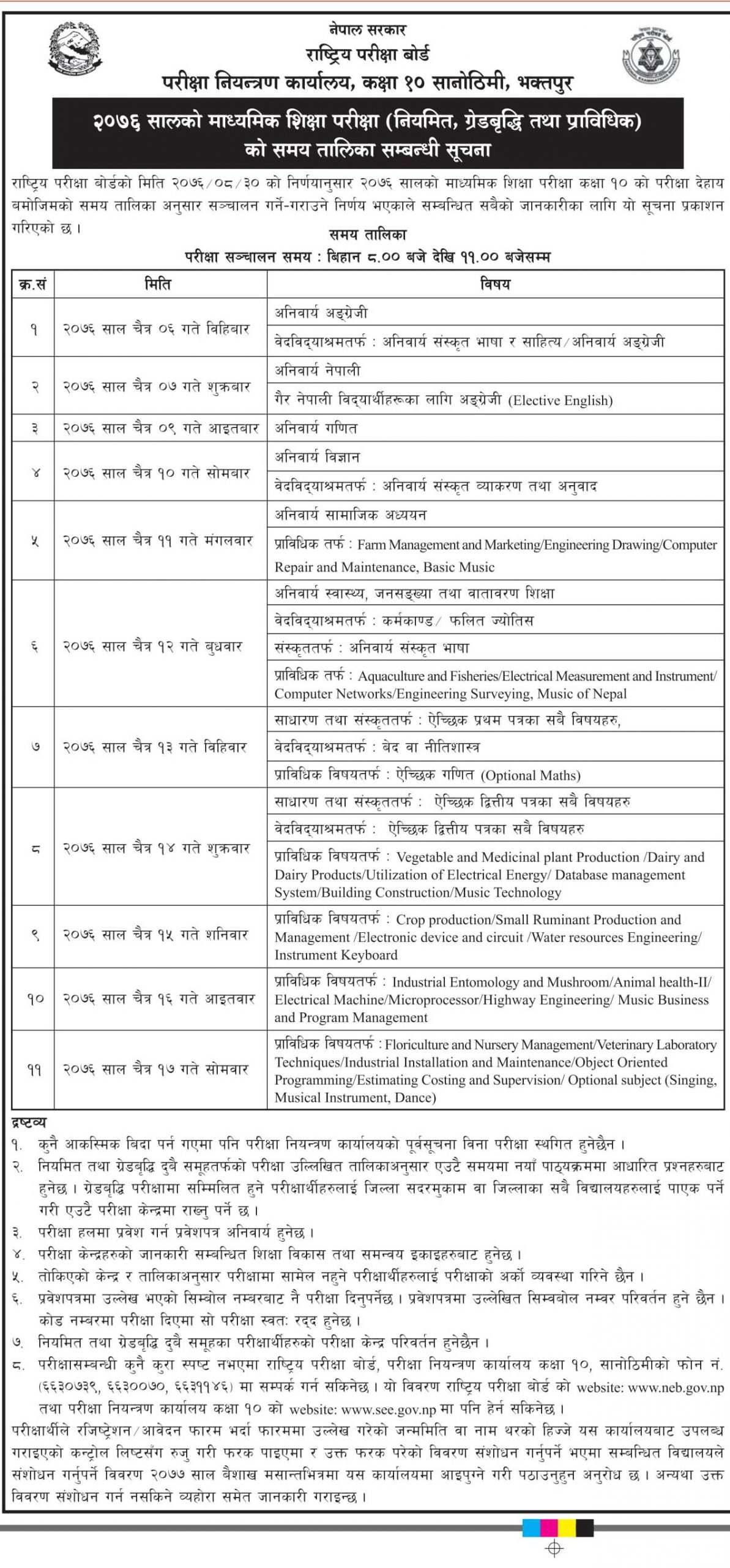 परीक्षाको तयारी अन्तिम चरणमा पुगेको राष्ट्रिय परीक्षा बोर्डले जनाएको छ । परीक्षा चैत्र ६ गतेदेखि १७ गतेसम्म चल्नेछ भने परीक्षाा समय विहान ८ बजेदेखि ११ बजेसम्म ताेकिएकाे छ ।