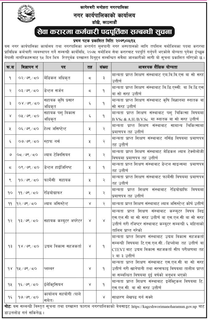 काठमाडौं- काठमाडौंको कागेश्वरी मनहरा नगरपालिकाले विभिन्न पदमा कर्मचारी माग गरेको छ । मूलपानी नगर अस्पतालमा करार सेवामा पदपूर्ति गर्नेगरी नगरपालिकाले दरखास्त आह्वान गरेको हो ।