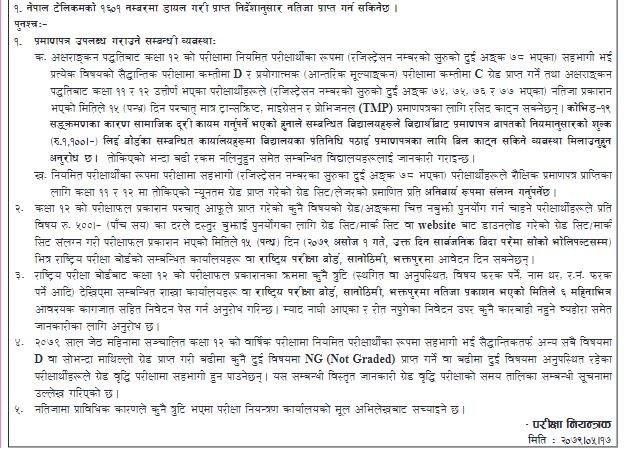 दुई विषयमा ननग्रेडिङ अर्थात एनजी आउने परीक्षार्थीले ग्रेडवृद्धि परीक्षा दिन पाउनेछन् । यसअनुसार ननग्रेडिङमा परेका एकलाख ८८ हजार ४ सय १० जना विद्यार्थीमध्ये १ लाख ३० हजार ८ सय ७८ जनाले ग्रेडवृद्धि परीक्षामा सहभागी हुन पाउनेछन् । ग्रेडवृद्धि परीक्षामा दुवै विषयमा कम्तिमा १ दशमलव ६ जीपीए ल्याएमा मात्र उच्च शिक्षा पढ्न पाइने बोर्डले जनाएको छ ।