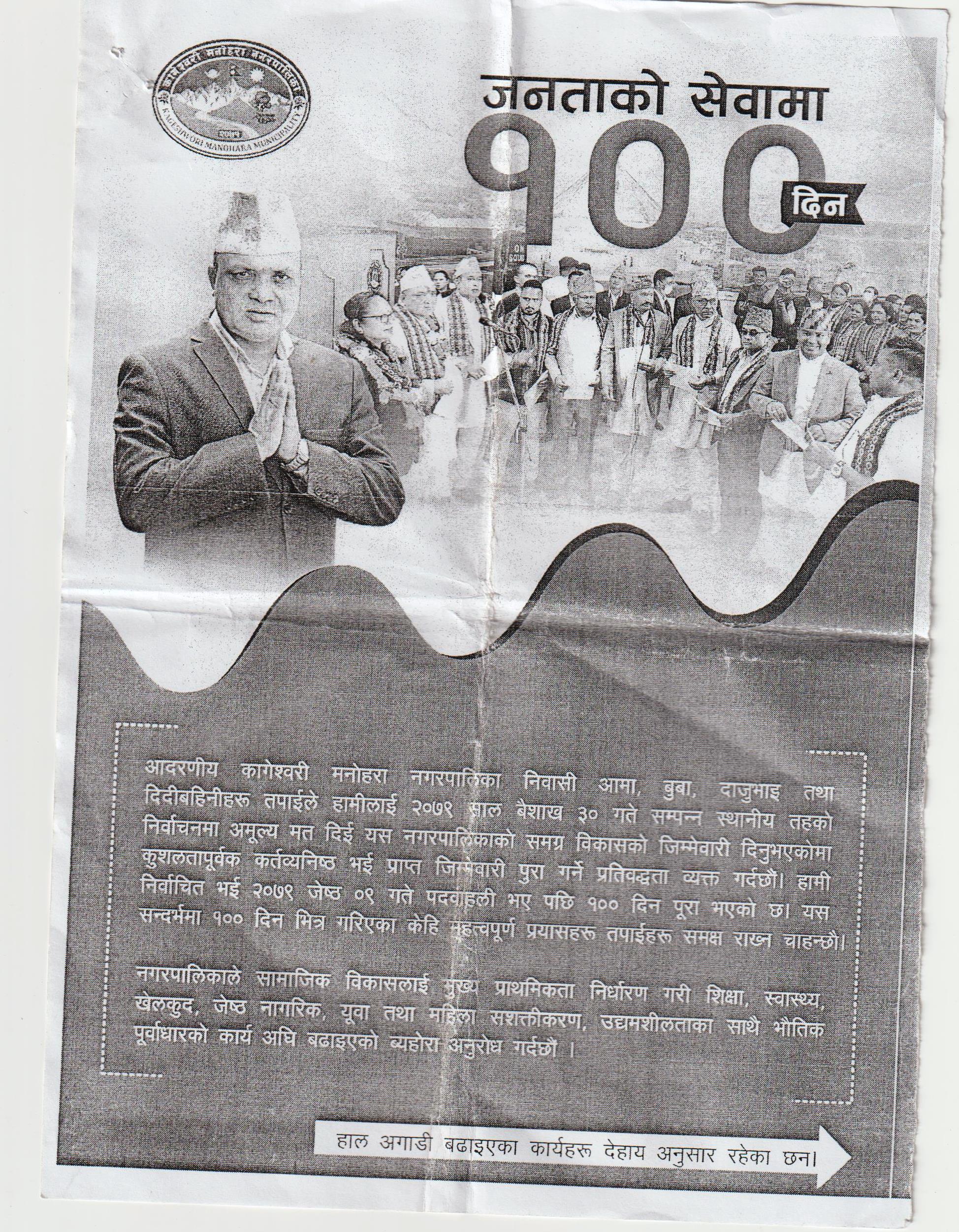 काठमाडौँ – काठमाडौँको कागेश्वरी मनोहरा नगरपालिकाका जनप्रतिनिधिले एक सय दिनको कार्यहरु सार्वजनिक गरेको छ । सोमबार पत्रकार सम्मेलनको आयोजना गर्दै एक सय दिनको अवधिमा गरिएका कामहरुको विवरण सार्वजनिक गरेको छ । नगरपालिकाको नगर प्रमुुख उपेन्द्र कार्कीले उपप्रमुख शान्ता थापा, प्रमुख प्रशासकीय अधिकृत भोजराज घिमिरे, वडा अध्यक्षहरु, कर्मचारीहरु लगायत सञ्चारकर्मीहरुको उपस्थितिमा उक्त कामहरु सार्वजनिक गरेका हुन् । जसअनुसार नगरपालिकाले नगर शिक्षा ऐन २०७५ को संशोधन गरेको, एक शिक्षक एक ल्याप कार्यक्रम अन्तरगत २०९ जना शिक्षकलाई ल्यापटप वितरण, संस्थागत विद्यालयको दर्ता र नविकरण शुल्कमा लाग्ने साविक रकममा २५ प्रतिशत घटाइएको कुरा नगर प्रमुख कार्कीले जानकारी दिए । यस्तै स्वास्थ्य क्षेत्रमा मुलपानी नगर अस्पतालको सेवा विस्तार तथा प्रभावकारी बनाउन थप जनशक्तिको व्यवस्थापनको प्रक्रिया अघि बढाइएको छ । मुलपानी नगर अस्पताललाई १५ शैय्याको अस्पताल भवन निर्माणको लागि २० करोड रकम संघीय सरकारबाट विनियोजन भई जग्गा लिज प्रक्रिया अगाडी बढाइएको मेयर कार्कीले बताए । यस्तै खानैपानी, शहरी विकास, विपद् व्यवस्थापनका क्षेत्रमा थुप्रै कामहरु भएको मेयर कार्कीको दाबी छ ।