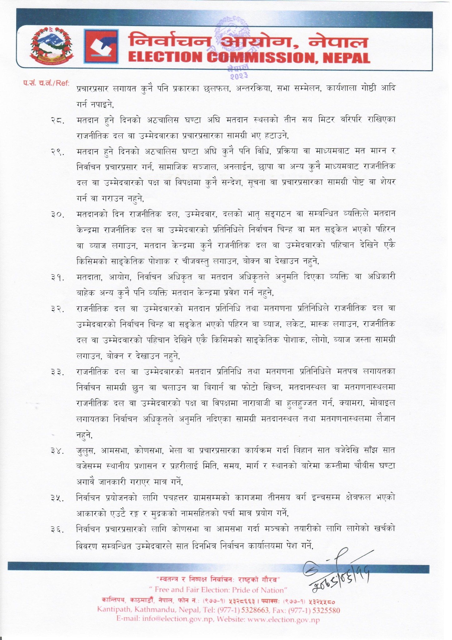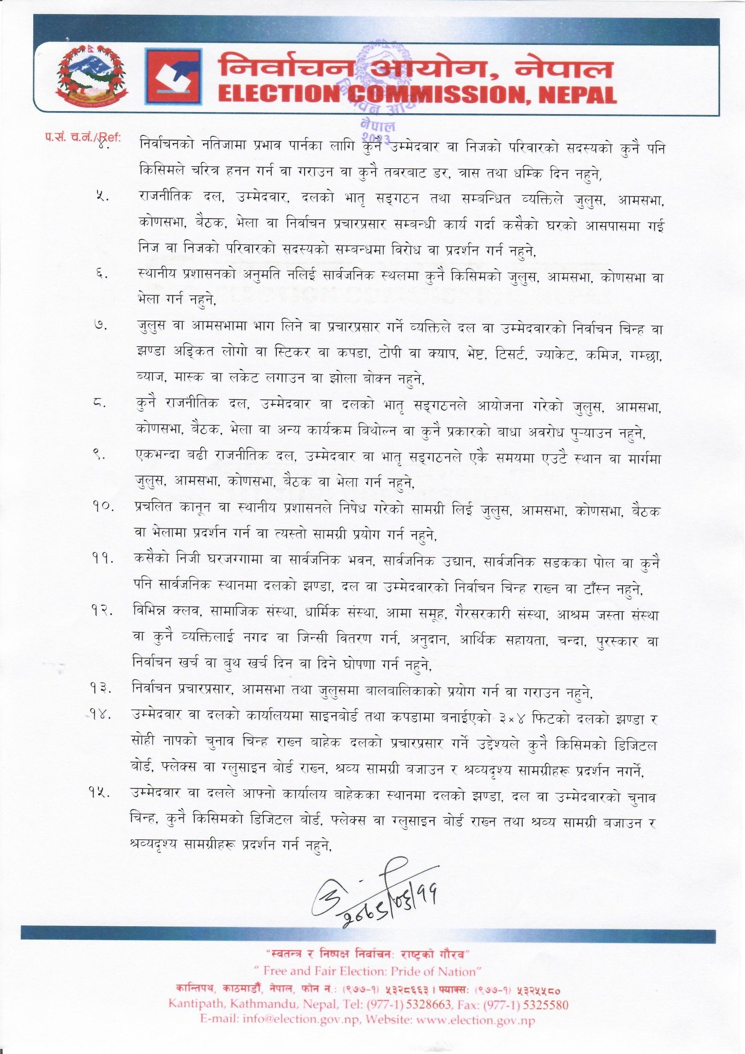 चुनाव अवधिभित्र कुनै पनि मतदातालाई मतदानको अधिकार प्रयोग गर्न वा नगर्नका लागि तथा मतदानको अधिकार प्रयोग गरे वा नगरेबापत उपहार, पुरस्कार, इनाम, दान–दातव्य र बकसका रूपमा नगद वा जिन्सी नदिन, सार्वजनिक भोजभतेरको आयोजना नगर्न आयोगले निर्देशन दिएको छ ।