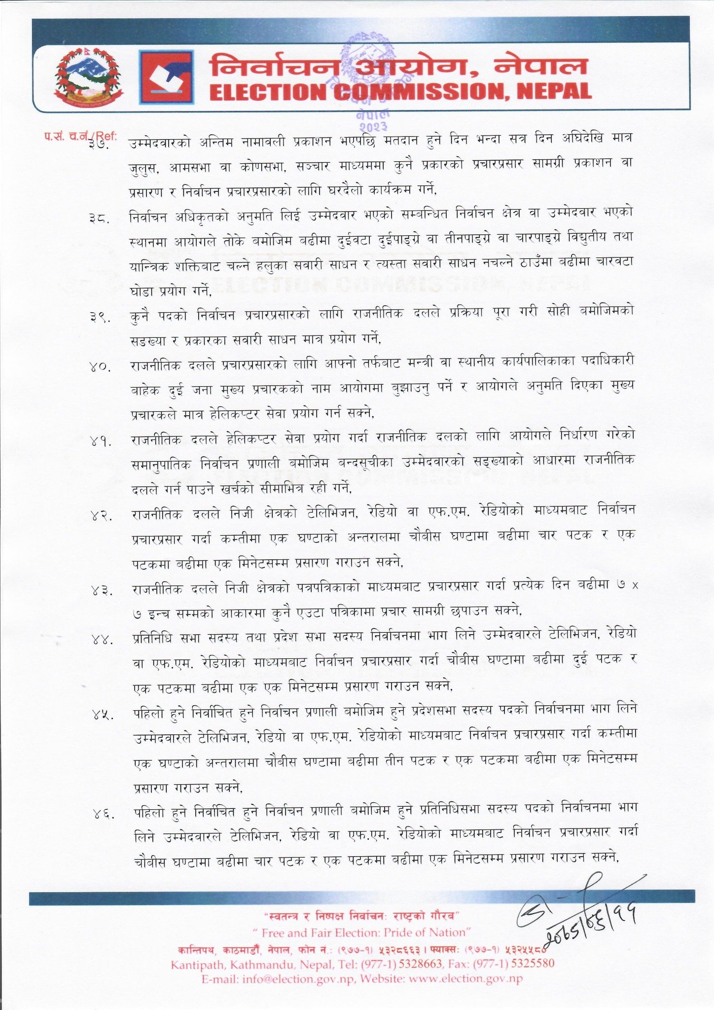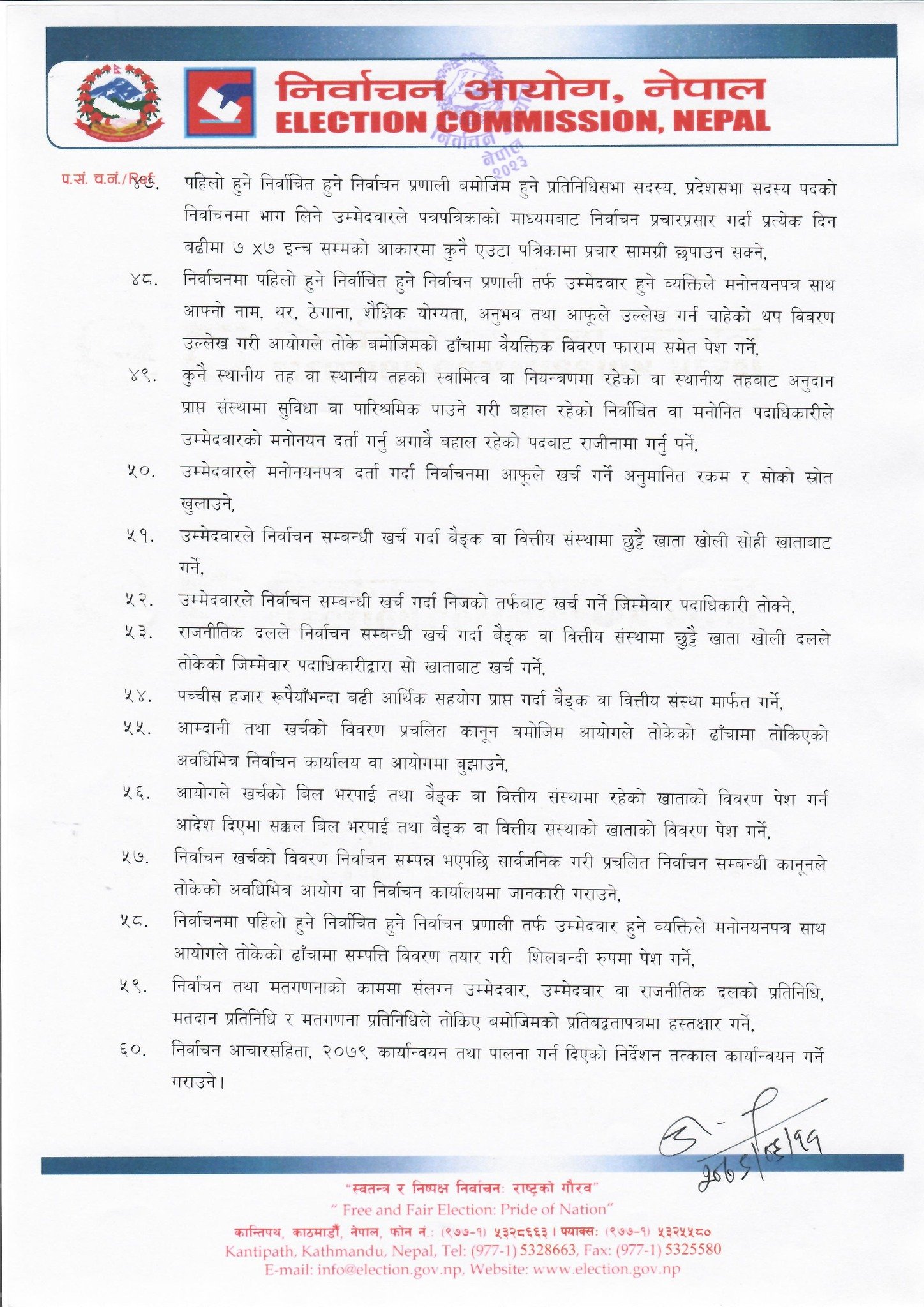 काठमाडौँ – निर्वाचन आयोगले आउँदाे मङ्सिर ४ गते हुने प्रतिनिधि सभा तथा प्रदेश सभा सदस्य चुनावलाई स्वच्छ, स्वतन्त्र, निष्पक्ष, पारदर्शी र भयमुक्त बनाउन राजनीतिक दलहरूलाई ६० बुँदे निर्देशन दिएको छ ।