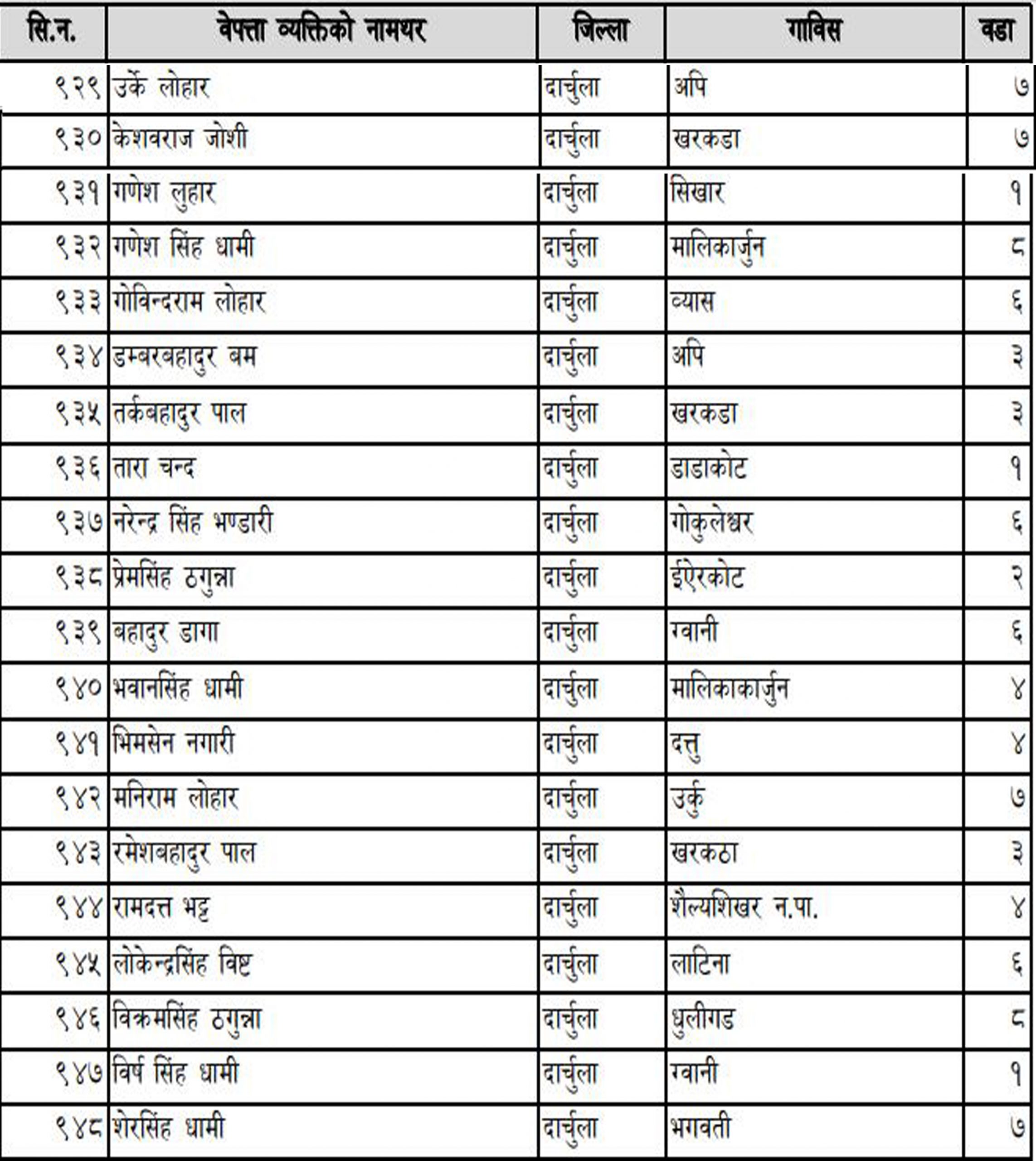 आयोगको अघिल्लो नेतृत्वले नै बेपत्ता पारिएका व्यक्तिबारे उजुरी आह्वान गरेर विवरण संकलन गरेको थियो । आयोगले सार्वजनिक गरेकोमा दार्चुलाबाट २० जना रहेका छन । तीनको नामावली तल उल्लेख गरिएको छ ।