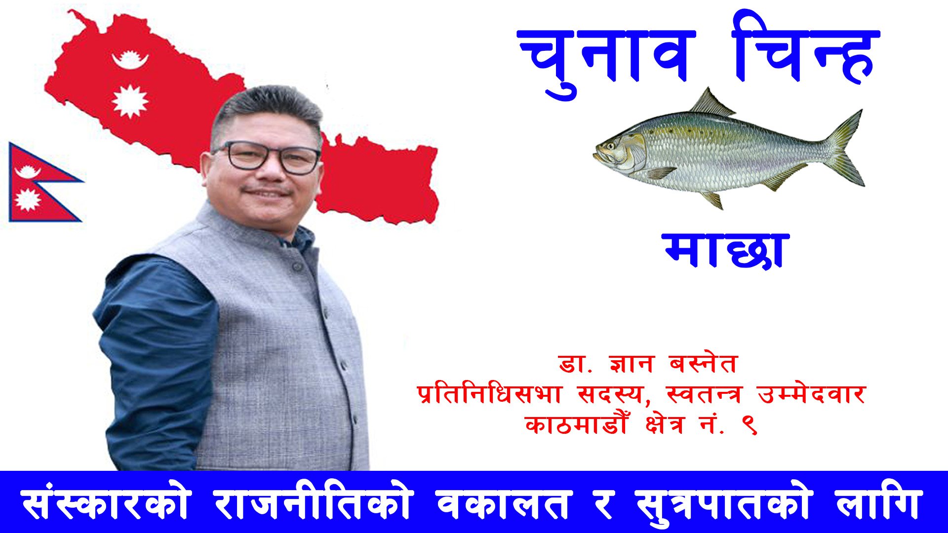 काठमाडौँ – काठमाडौँ क्षेत्र नं. ९ बाट प्रतिनिधिसभा सदस्यका स्वतन्त्र उम्मेदवार डा. ज्ञान बस्नेतले ‘माछा’ चुनाव चिन्ह पाएका छन् ।