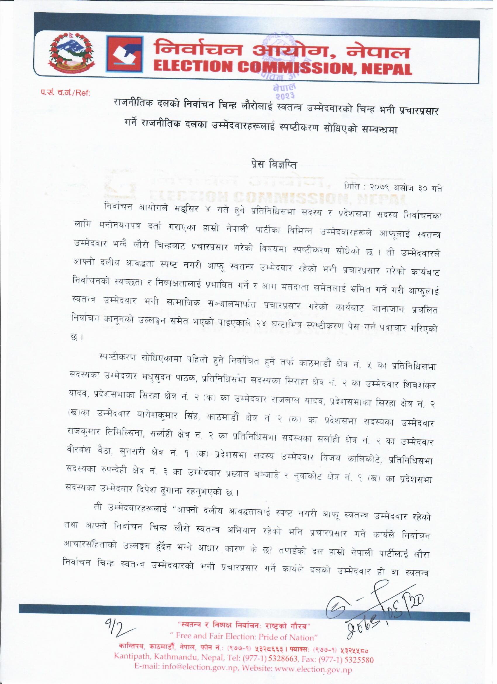 विभिन्न अभियानका नाममा उम्मेदवारी दिएकाहरूले हाम्रो नेपाली पार्टीको चुनाव चिन्ह लौरोलाई स्वतन्त्र उम्मेदवारको चुनाव चिन्ह भन्दै प्रचार गरिरहेको पाइएकोले स्पष्टीकरण सोध्नुपरेको आयोगले जनाएको छ।