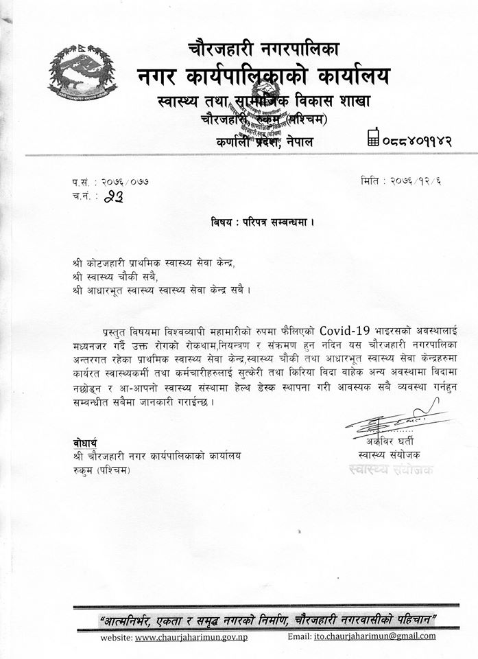 रुकुम पश्चिमको चौरजहारी नगरपालिकाले महामारीको रुपमा फैलिएको कोभिड–१९ (कोरना) भाइरसको संक्रमणलाई मध्यनजर गर्दै स्वास्थ्य संस्था नछोड्न स्वास्थ्यकर्मीहरुलाई परिपत्र गरेको छ ।