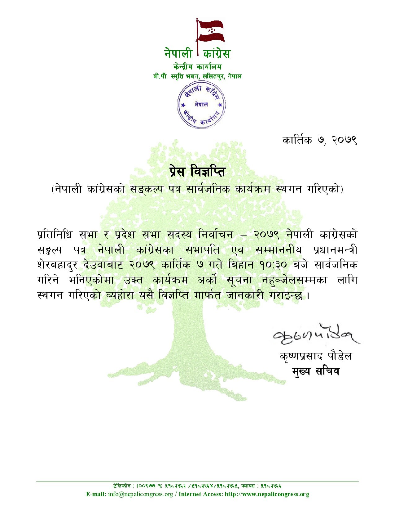 पार्टीका मुख्यसचिव कृष्णप्रसाद पौडेलले आज बिहान विज्ञप्ति निकालेर अनिश्चितकालका लागि घोषणा पत्र सार्वजनिक कार्यक्रम स्थगित गरिएको बताएका छन्। आइतबार अपरान्ह ५ बजे घोषणा पत्र सार्वजनिक गर्ने कांग्रेसको तयारी भए पनि स्थगित गरिएको थियो। सोमबार बिहान १०:३० बजे घोषणा पत्र सार्वजनिक गर्ने भने पनि आज पनि घोषणा पत्र सार्वजनिक नहुने भएको छ।
