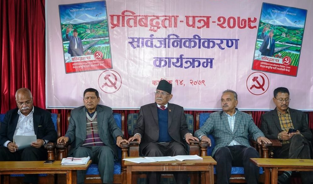 काठमाडौं – मंसिर ४ गते हुने प्रतिनिधि तथा प्रदेश सभा निर्वाचनको लागि नेकपा माओवादी केन्द्रले आफ्नो प्रतिबद्धता पत्र सार्वजनिक गरेको छ । प्रतिबद्धता पत्रमा माओवादीले प्रशासन संयन्त्रको पुनर्संरचनाको विषयलाई पनि उठाएको छ ।