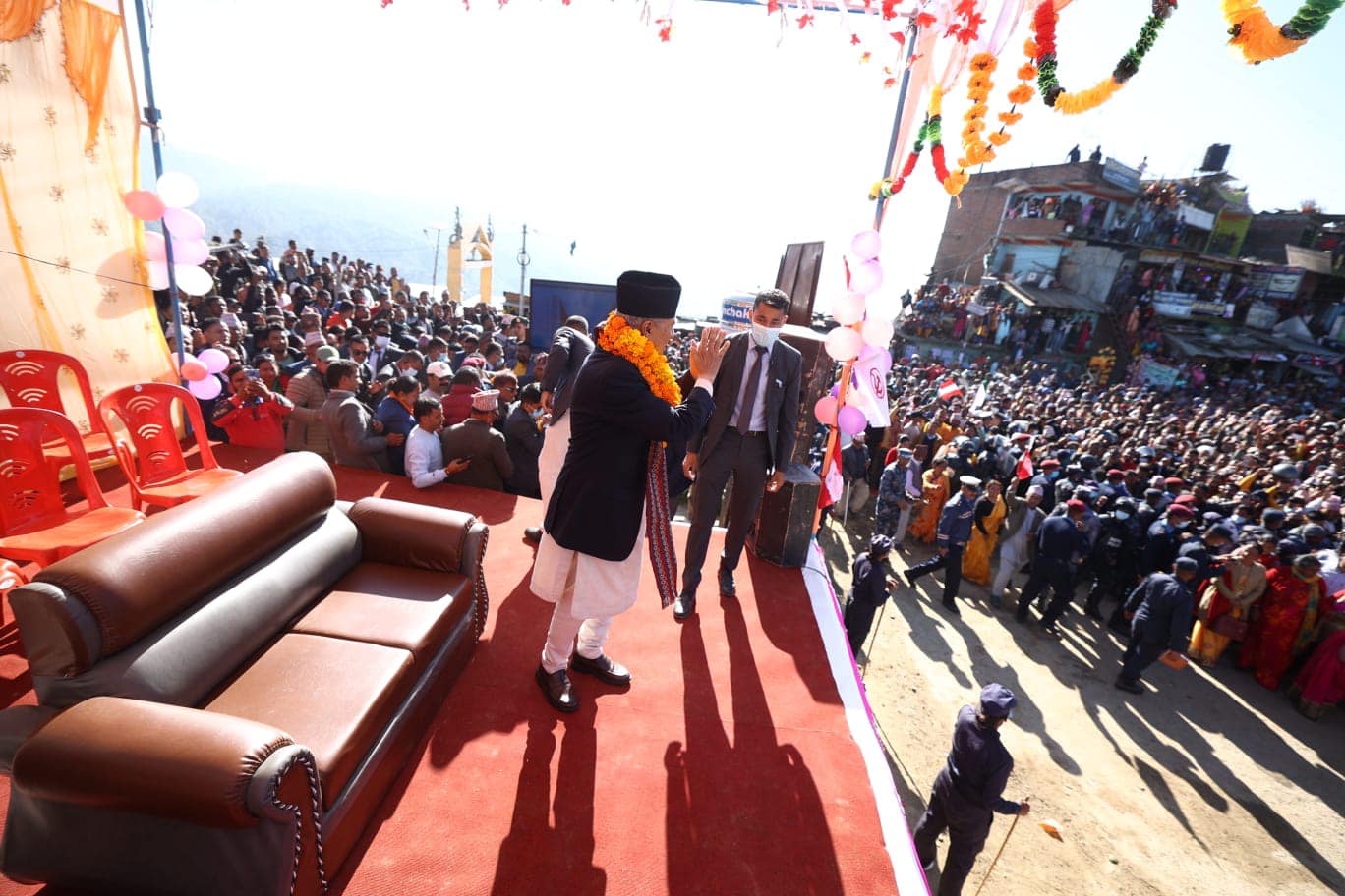 उनले आफु पाँचौपटक प्रधानमन्त्री भइसकेको र डडेल्धुराको विकासमा लागिरहेको बताउँदै केही काम गर्न भने बाँकी रहेको बताए । उनले भने– ‘डडेल्धुरामा मेडिकल कलेज भइसकेको छ । एयरपोर्ट बन्दै छ । म यहाँको सहयोगले म पाँच पटक प्रधानमन्त्री भइसकेको छु । यहाँको सहयोगले फेरि अगाडि बढ्नेछु । डडेल्धुरामा केही काम गर्न बाँकी छन् । त्यसलाई पूरा गर्ने छु । यहाँको सडक पिच गर्ने छु । विमानस्थल बनाउने छु । सबैलाई खानेपानी पुर्याउने विश्वास दिलाउँछु ।’