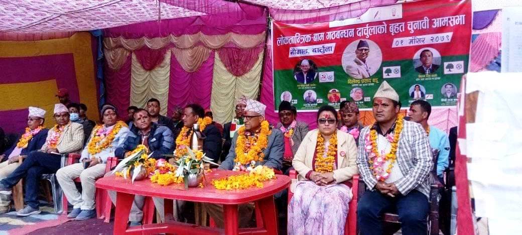 यस्तै प्रदेश सभा क्षेत्र नम्बर १ का उम्मेदवार विक्रम सिंह धामीले राजनीति भनेको संकल्प, प्रण र आदर्श भएको बताउनुभयो । राजनीतिको संकल्प, प्रण र आदर्शले समाज रुपान्तरण गर्नुपर्ने उहाले बताउनुभयो । गठबन्धन देशको आवश्यकता भएको भन्दै संविधान र व्यवस्था जोगाउन गठबन्धनलाई मत दिनुको विकल्प नरहेको उहाँले बताए । साथै उहाँले दार्चुलालाई हिन्दुधर्मालम्बीहरुको तीर्थस्थल बनाउन आफूूहरुले काम गर्ने बताए ।