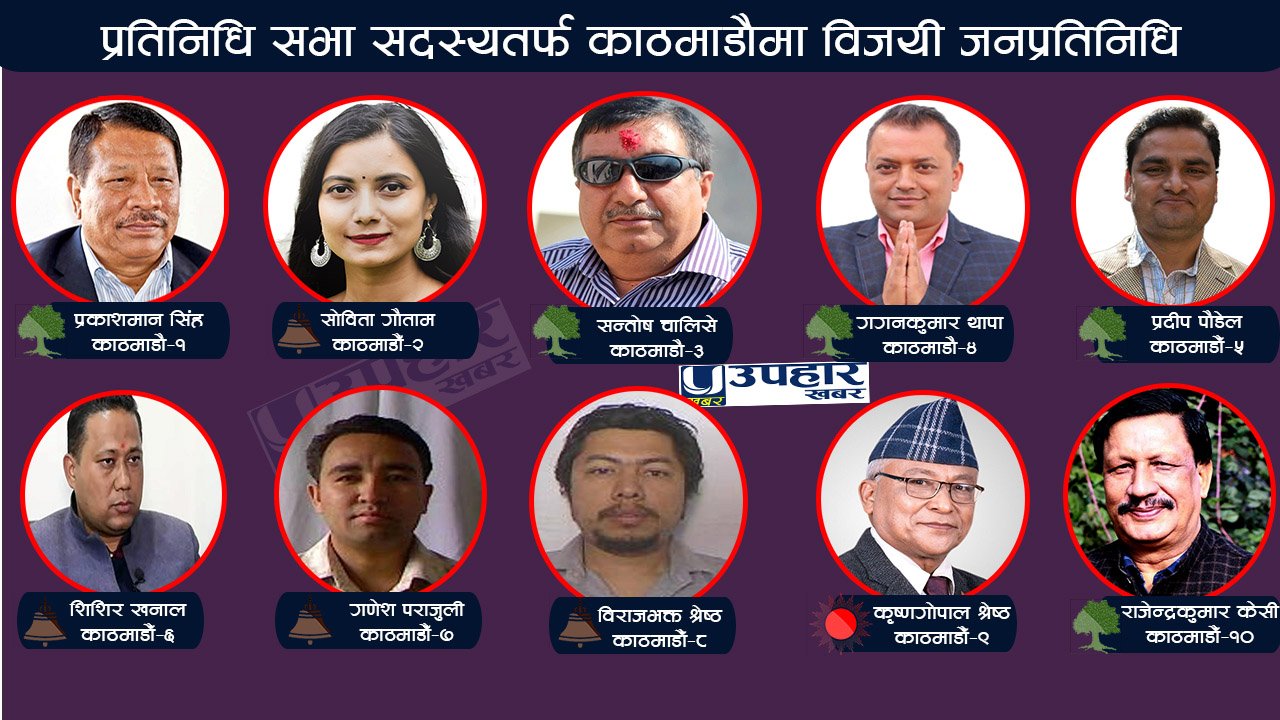 यस्तै काठमाडौँ–४ र ५ बाट कांग्रेसका गगनकुमार थापा र प्रदिप पौडेल विजयी भएका छन् । यसैगरी काठमाडौँ–६, ७ र ८ बाट क्रमश राष्ट्रिय स्वतन्त्र पार्टीका शिशिर खनाल, गणेश पराजुली र विराजभक्त श्रेष्ठ निर्वाचित भएका छन् ।