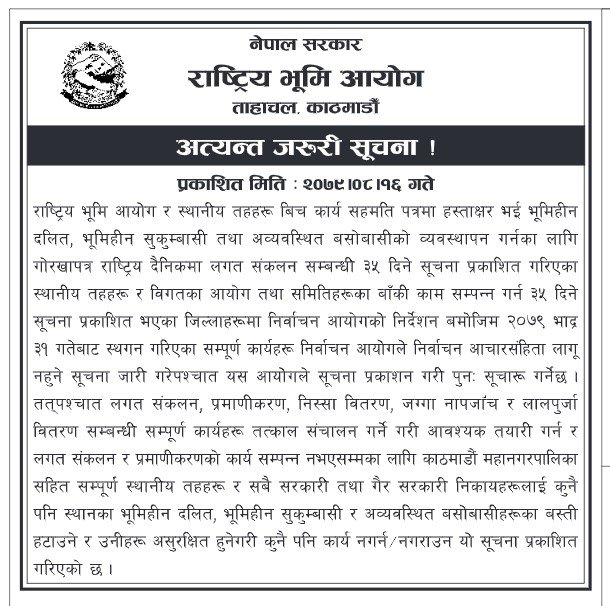 आयोगले आज गोरखापत्रमा सूचना निकालेर काठमाडौं महानगरसहित सम्पूर्ण स्थानीय तहहरू र सबै सरकारी तथा गैरसरकारी निकायलाई कुनै पनि स्थानका सुकुम्बासीलाई अहिले नै नहटाउन भनेको छ। ‘कुनै पनि स्थानका भूमिहीन दलित, भूमिहीन सुकुम्बासी र अव्यवस्थित बसोबासीहरूका बस्ती हटाउने र उनीहरू असुरक्षित हुने गरी कुनै पनि कार्य नगर्न/नगराउन यो सूचना प्रकाशित गरिएको छ,’ आयोगको ताहाचल कार्यालयले जारी गरेको सूचनामा भनिएको छ । आयोगले सुकुम्बासीका लगत संकलन, प्रमाणीकरण, निस्सा वितरण, जग्गा नापजाँच, लालपुर्जा सम्बन्धी सबै कार्य निर्वाचन आयोगले आचारसंहिता लागु नहुने सूचना जारी गरेलगत्तै गरिने पनि बताएको छ। आयोगले भदौ ३१ देखि भूमिहीनका लगत संकलनलगायत काम रोकेको थियो। आचारसंहिता लागु नहुने सूचना निर्वाचन आयोगले जारी गरेपछि भूमि आयोगले आफ्ना कामलाई निरन्तरता दिने पनि बताएको छ।