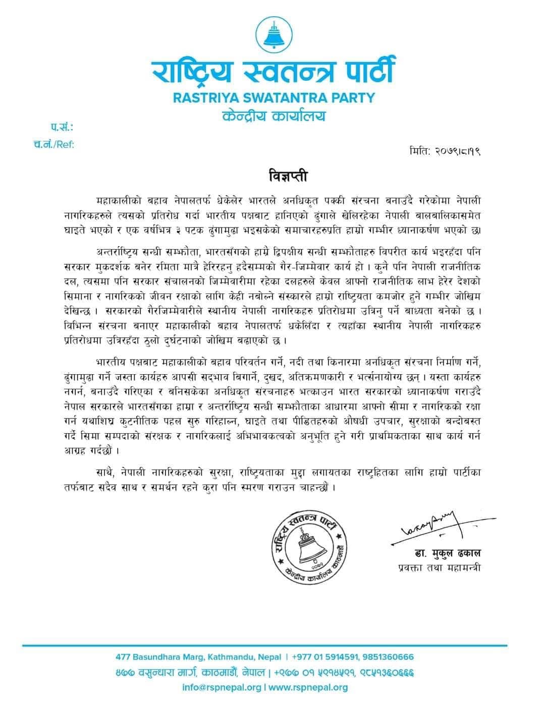 अन्तर्राष्ट्रिय सन्धि सम्झौता, भारतसँगको हाम्रै द्विपक्षीय सन्धि सम्झौताहरू विपरीत कार्य भइरहँदा पनि सरकार मूकदर्शक बनेर रमिता मात्रै हेरिरहनु हदैसम्मको गैरजिम्मेवार कार्य भएको पार्टीको ठहर छ ।’ सरकारको गैरजिम्मेवारीले स्थानीय नेपाली नागरिकहरू प्रतिरोधमा उत्रिनु पर्ने वाध्यता बनेको छ । विभिन्न संरचना बनाएर महाकालीको बहाव नेपालतर्फ धकेलिँदा र त्यहाँका स्थानीय नेपाली नागरिकहरू प्रतिरोधमा उत्रिरहँदा ठूलो दुर्घटनाको जोखिम बढाएको छ,’ प्रवक्ता डा.मुकुल ढकालद्वारा जारी विज्ञप्तिमा भनिएको छ ।