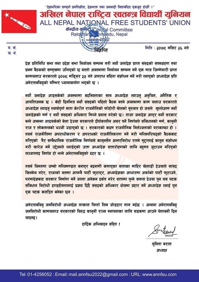 अनेरास्ववियु अध्यक्ष सुनिता बरालले आज एक विज्ञप्ति जारी गर्दै सरकारले ल्याएकाे अध्यादेश जनविराेधि भएकाे भन्दै अध्यादेश फिर्ता नलिए अनेरास्ववियु जनविरोधी कामचलाउ सरकारको विरुद्ध कानुनी राज्य स्थापनाका लागि सडकमा आउने चेतावनी दिए ।