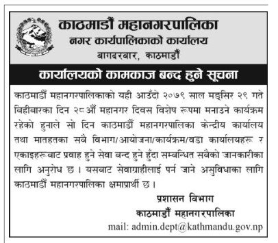 महानगरपालिकाले एक सूचना जारी गर्दै केन्द्रीय कार्यालय तथा मातहतका सबै विभाग/आयोजना/कार्यक्रम/वडा कार्यालयहरू र एकाइहरूबाट प्रवाह हुने सेवा बन्द रहने जानकारी दिएको हो । महानगरले बिहीबार २८ औं महानगर दिवस विशेष कार्यक्रमका साथ मनाउँदैछ ।