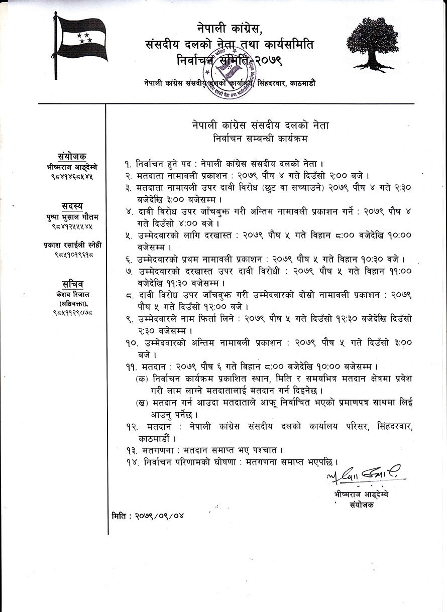 कांग्रेस संसदीय दलको नेताको चुनाव पुस ६ गते, यस्तो छ निर्वाचन तालिका