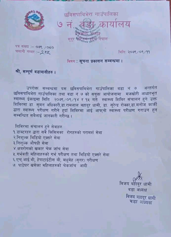 बझाङ- बझाङको छबिसपाथिभेरा गाउँपालिका–७ मा दुइ दिने स्वास्थ्य शिविर सञ्चालन हुने भएको छ । छबिसपाथिभेरा गाउँपालिका र वडा कार्यालयको संयुक्त आयोजनामा यही पौष १४ र १५ गते दुई दिन मजखोरी आधारभूत स्वास्थ्य ईकाइमा शिविरको सञ्चालन हुने भएको हो । वडाध्यक्ष विजयबहादुर धामीका अनुसार शिविरमा डा. सुमन अधिकारी, डा. रामलालबहादुर धामी, डा. सुरेन्द्र रोक्का, डा. मनोज कार्कीले स्वास्थ्य परीक्षण गर्नेछन् । शिविरमा सबै किसिमका रोगको परामर्श, निःशुल्क भिडियो एक्सरे, निःशुल्क औषधि वितरण, क्षयरोगको खकार चेकजाँच, गर्भवती महिलाको गर्भ परीक्षण तथा भिडियो एक्सरे, एचआइभी, हेपाटाइटीस बी, मधुमेह परीक्षण, पाठेघर खसेका महिलाको चेकजाँचलगायत सेवा प्रदान गरिने वडाध्यक्ष धामीको हस्ताक्षरित सूचना उल्लेख गरिएको छ। उनले सबै वडावासीलाई सेवा लिन आउन पनि आग्रह गरेका छन् । ‘घर आँगनमै विशेषज्ञ डाक्टरहरूको टोली ल्याएर शिविर सञ्चालन गर्दैछौँ । वडाबासीको स्वास्थ्य समस्यालाई मध्यनजर गर्दै गाउँपालिका र वडाले शिविरको आयोजना गरिरहेको हो । सबै वडाबासीलाई सेवा लिनका लागि आउन आग्रह गर्छु,’ वडाध्यक्ष धामीले भने ।