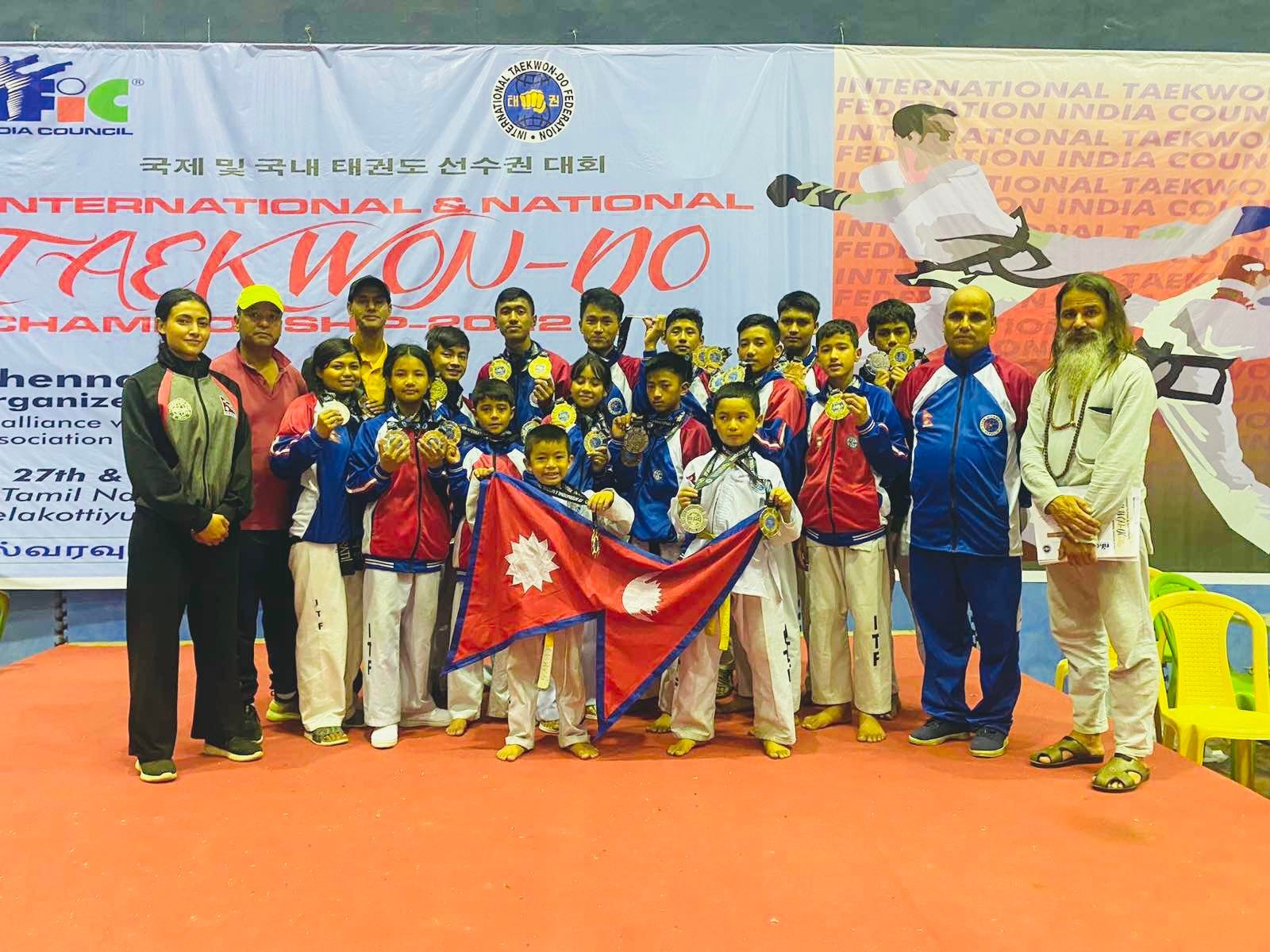 काठमाडौ – भारतको चेन्नईस्थित तमिलनाडुमा जारी अन्तराष्ट्रिय तेक्वान्दो प्रतियोगितामा नेपालले १२ स्वर्ण, ९ रजत र ४ काश्य पदक जितेको छ । चेन्नईकाे तमिलनाडु फिजिकल एजुकेशन तथा स्पोर्ट्स युनिभर्सिटीमा यही पुस १२ र १३ गते (डिसेम्बर २७, २८ तारिक)मा सम्पन्न अन्तराष्ट्रिय तेक्वान्दो प्रतियोगीतामा नेपालबाट १२ जना पुरुष र ३ जना महिला गरी १५ खेलाडी सहभागी भएका थिए ।