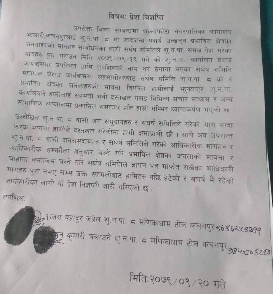 शुक्लाफाँटा नगरले झुक्याएर सहमति गर्य‍ो, सम्झौता पत्रमा गरेको हस्ताक्षर अस्वीकार