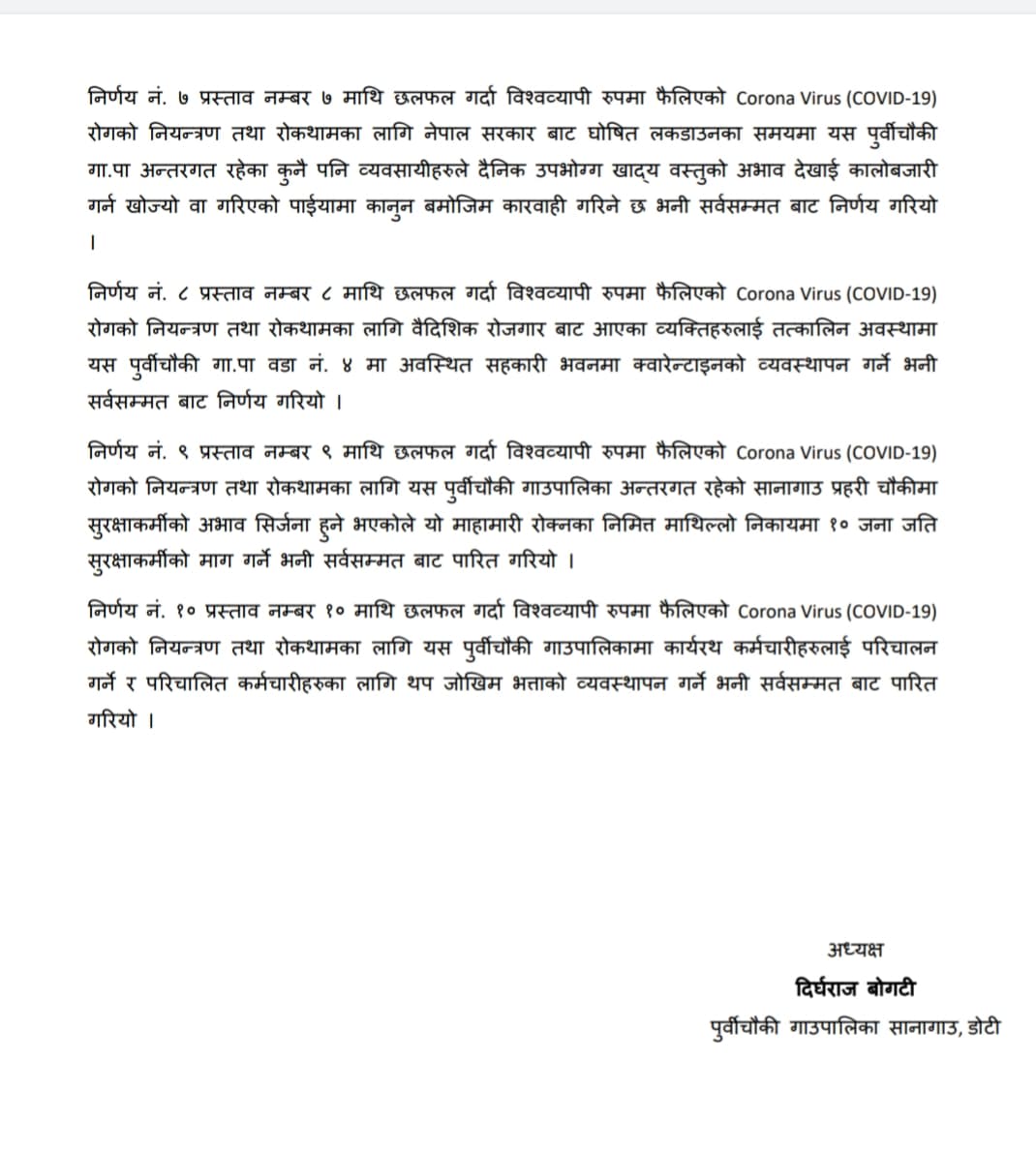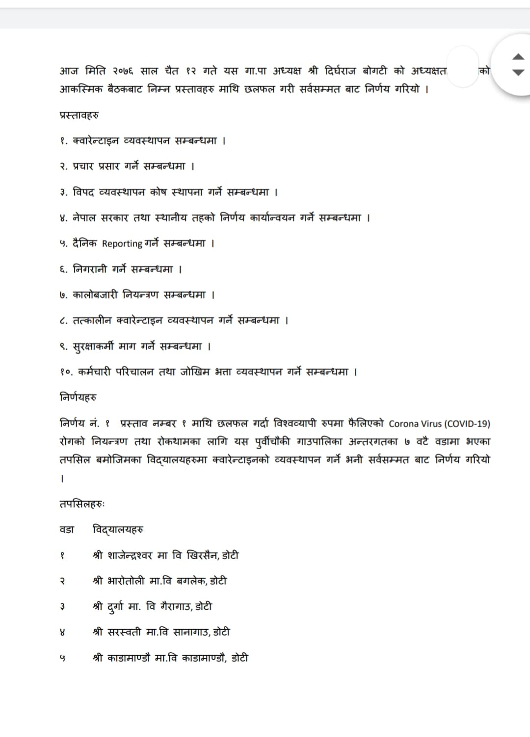 डोटी – पुर्वीचौकी गाउँपालिका, डोटीको गाउँकार्यपालिकाको आकस्मिक बैठक बसेर कोरोना भाइरसको रोकथाम तथा नियन्त्रण सम्बन्धमा महत्वपुर्ण निर्णयहरु गरेको छ ।