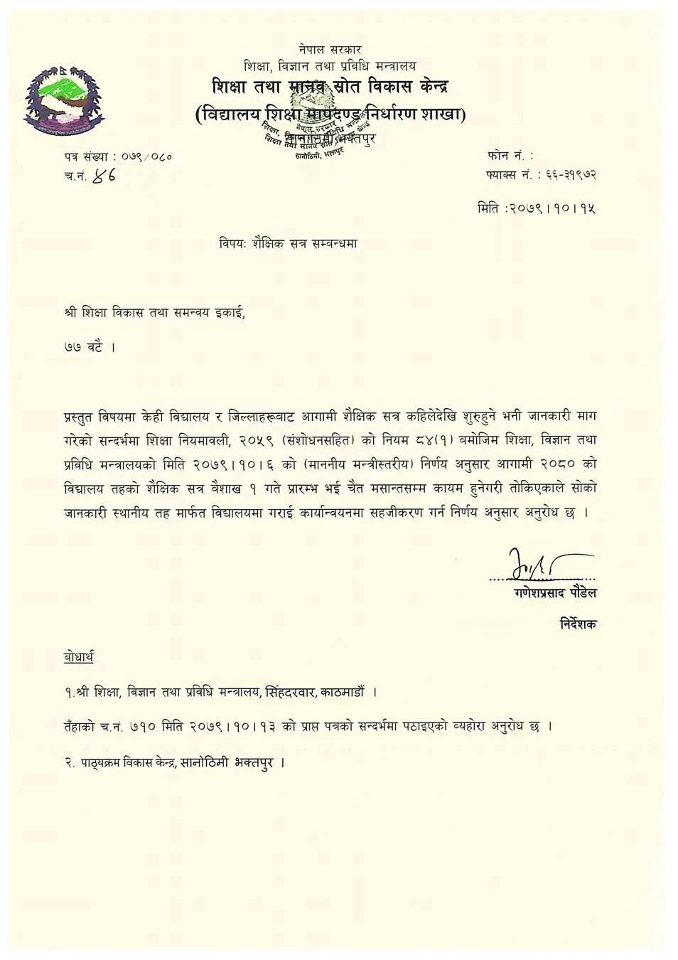 केन्द्रले सबै शिक्षा विकास तथा समन्वय इकाईलाई पत्राचार गर्दै आगामी शैक्षिक सत्र १ वैशाखबाट सुरु हुने जनाएको छ ।