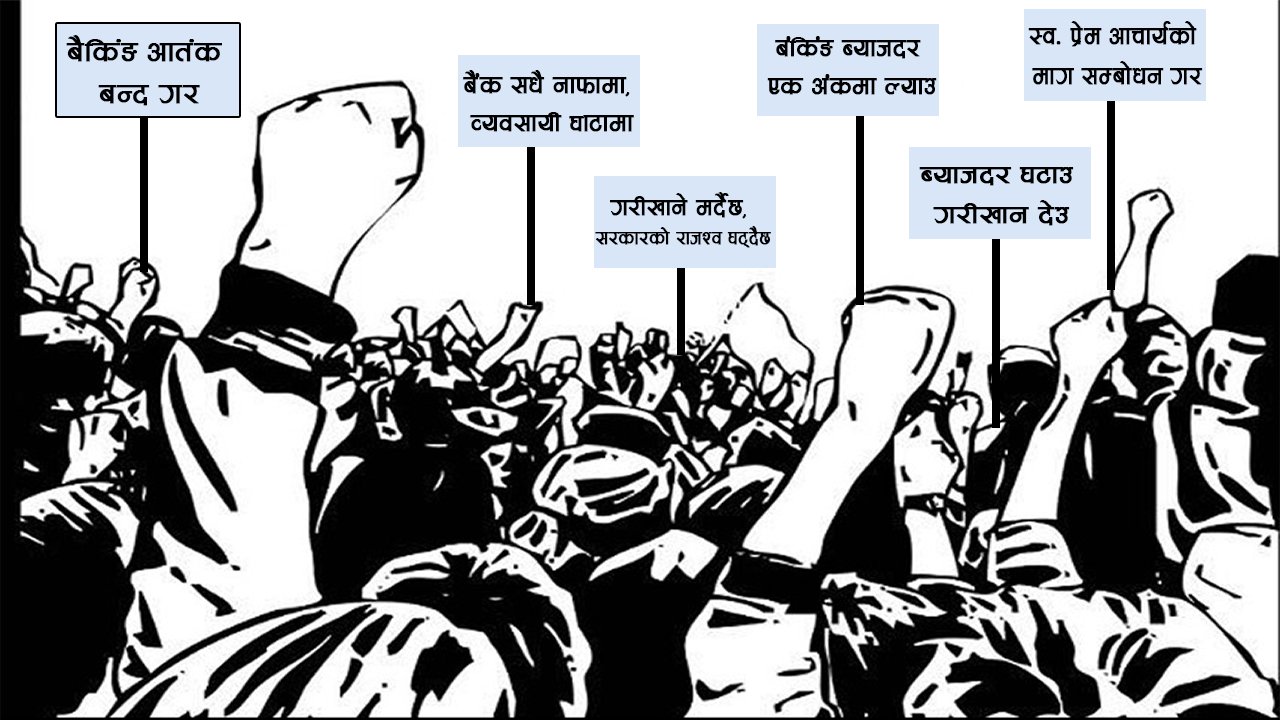काठमाडाैँ  – नेपाल राष्ट्रिय व्यवसायी महासंघ र नेपाल व्यापार संघले भोली बिरोध सभाको घोषणा गरेको छ । ११ बुदामा विरोध नारा तय गर्दै विरोध सभाको घोषणा गरेको हो । बैकिंङ आतंक बन्द गर, बैंक सधै नाफामा, उद्योगी व्यवसायी घाटामा, गरीखाने मर्दैछ, सरकारको राजश्व घट्दैछ लगायतका नारा तय गरेका छन् । यसैगरी बंकिंङ ब्याजदर एक अंकमा ल्याउ, ब्याजदर घटाउ गरीखान देउ, उद्योग व्यापार बचाउँ, राष्ट्रिय अर्थतन्त्र उठाउ, स्व. प्रेम आचार्यको माग सम्बोधन गर, व्यवसायिक वातावरण कायम गर, सम्पूर्ण उद्योगी व्यवसायी एक हौँ, उद्योगी व्यवसायीलाई आत्महत्या गर्न बाध्य नपार तथा सहज व्यवसायिक वातावरण कामय गर लगायतका नारा तय गरिएको नेपाल व्यापार संघका अध्यक्ष हरि गौतमले जानकारी दिनुभयो ।