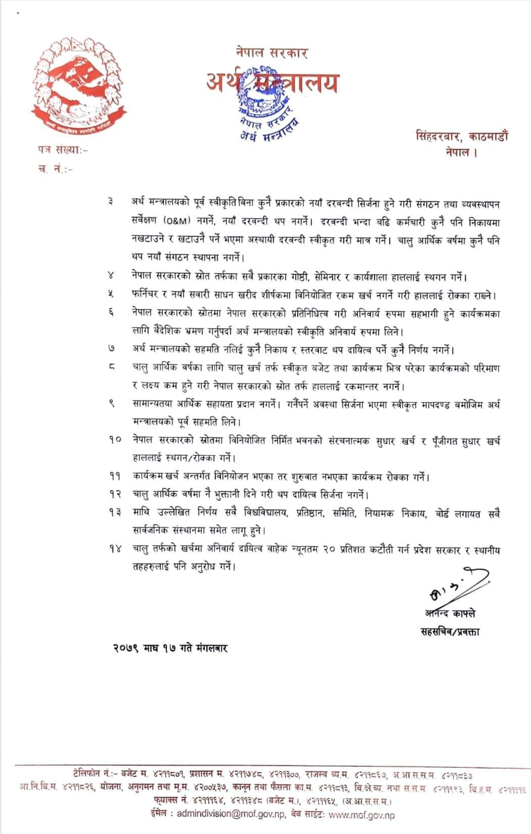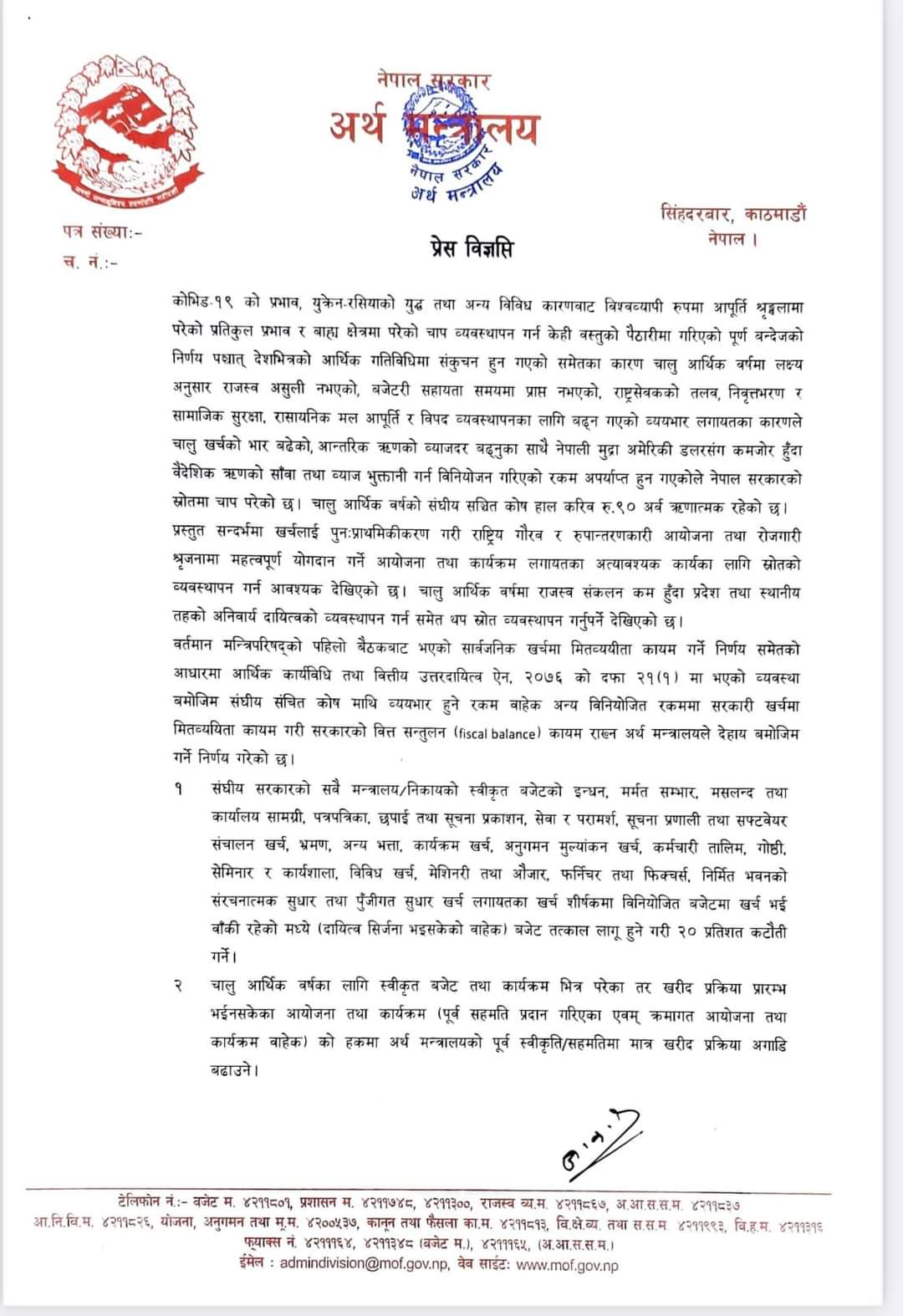 काठमाडौं – अर्थ मन्त्रालयले देशको आर्थिक अवस्थालाई मध्यनजर गर्दै सरकारको आन्तरिक खर्च कटौती गर्ने निर्णय गरेको छ । मन्त्रालयले मंगलबार १४ बुँदे निर्देशिका जारी गर्दै सरकारको वित्त सन्तुलन कायम राख्न खर्च कटौती गर्ने निर्णय गरेको हो । मन्त्रालयको निर्णयले चालु आर्थिक वर्षमा राज्यको २४ अर्ब ५० करोड रुपैयाँ बचत हुने विज्ञप्तिमा उल्लेख छ । मन्त्रालयका अनुसार यो वर्ष नयाँ सवारी साधन नकिन्ने, सरकारको स्रोतबाट सबै प्रकारका गोष्ठी, सेमिनार र कार्यशाला स्थगित गर्ने निर्णय भएको छ ।