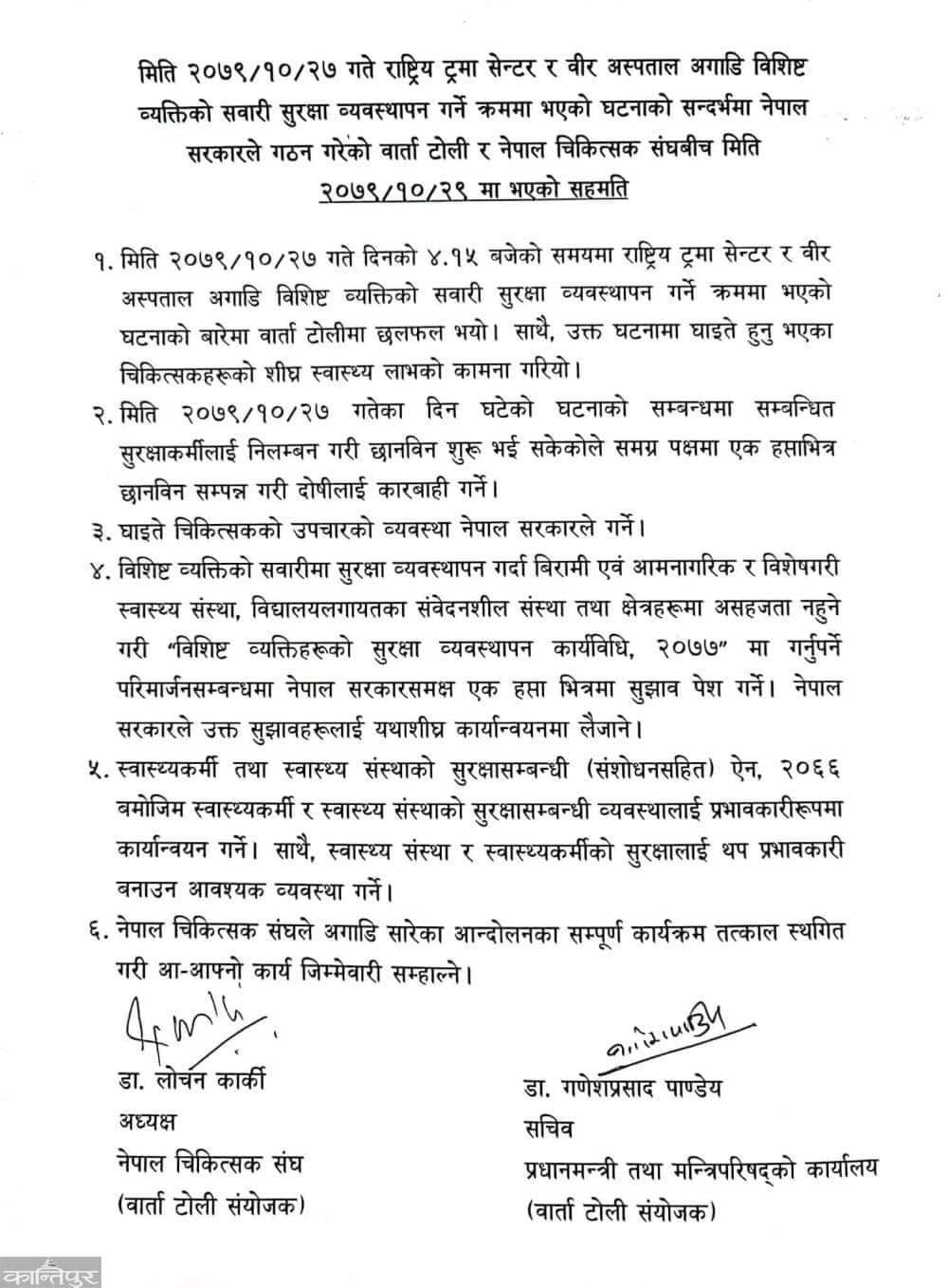 सोहि बिषयलाइ लिएर आज बिहान प्रधानमन्त्री कार्यालयमा वार्ता भएको थियो । वार्तामा ६ बुँदे सहमति भएको छ । चिकित्सक कुटिएको घटनाको समग्र पक्षमा एक हप्ताभित्र छानबिन सम्पन्न गरी दोषीलाई कारबाही गर्ने, घाइते चिकित्सकको उपचारको व्यवस्था सरकारले गर्ने, विशिष्ट व्यक्तिहरुको सुरक्षा व्यवस्थापन कार्यविधिमा परिमार्जन गर्न सरकारलाई सुझाव दिने, स्वास्थ्यकर्मी र स्वास्थ्य संस्थाको सुरक्षा व्यवस्थालाई प्रभावकारी कार्यान्वयन गर्ने र चिकित्सक संघले आन्दोलन स्थगित गर्ने सहमतिपत्रमा उल्लेख छ ।