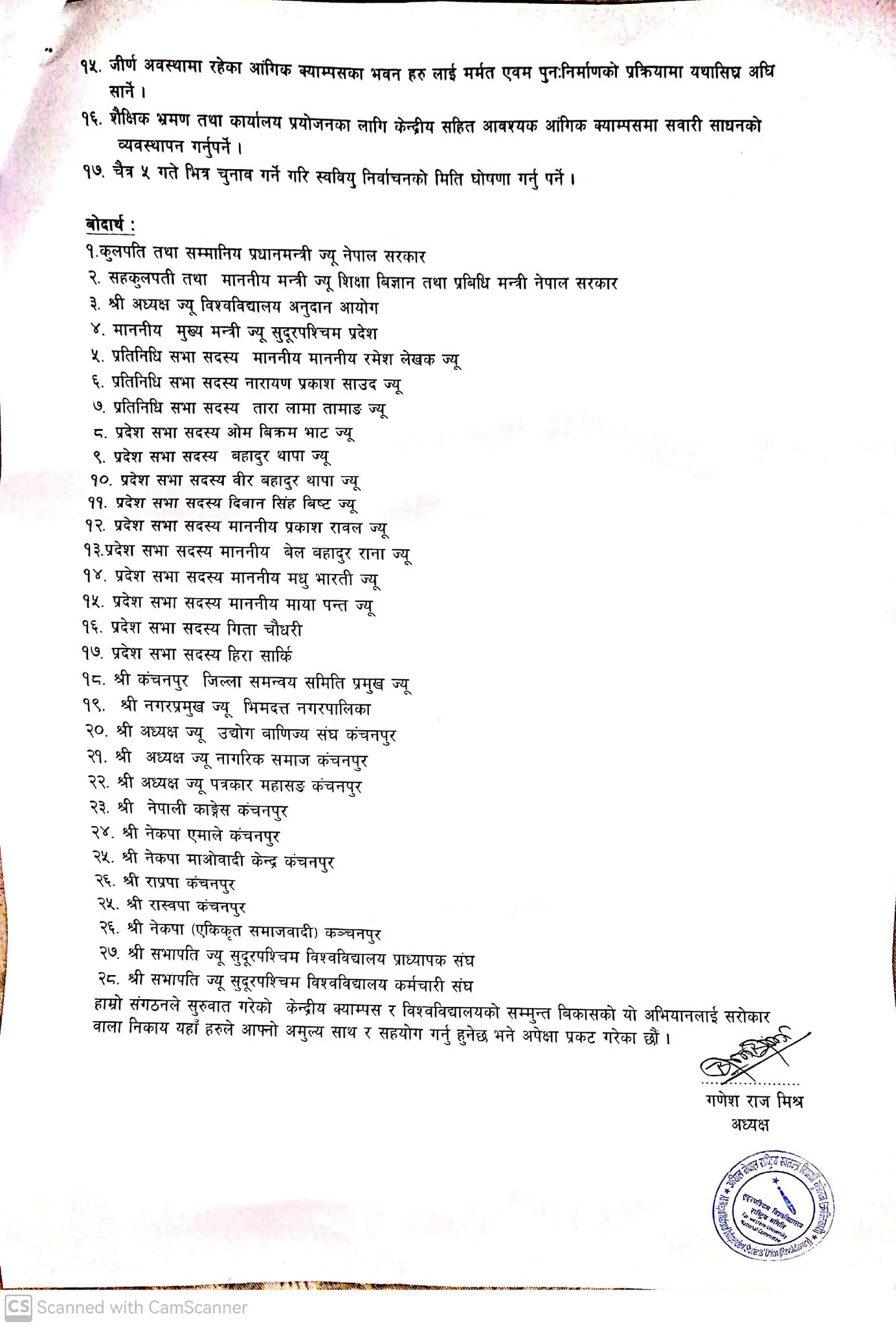 सुदूरपश्चिम विश्वविद्यालय स्थापनाका लागि विभिन्न समयमा भएका आन्दोलन र संघर्षहरुको उपलब्धि स्वरुप कंचनपुरको महेन्द्रनगरमा सुदूरपश्चिम विश्वविद्यालयको स्थापना भएको र उक्त आन्दोलनका क्रममा महेन्द्रनगर लगायत विभिन्न ठाउँमा भौतिक रुपमा विभिन्न ब्यक्ति तथा ठाउँहरुले घाटा ब्यहोरेको तथा विश्वविद्यालय स्थापनाको आशमा सबैले साथ दिदै अगाडी बढेको समेत स्मरण गराएको छ ।