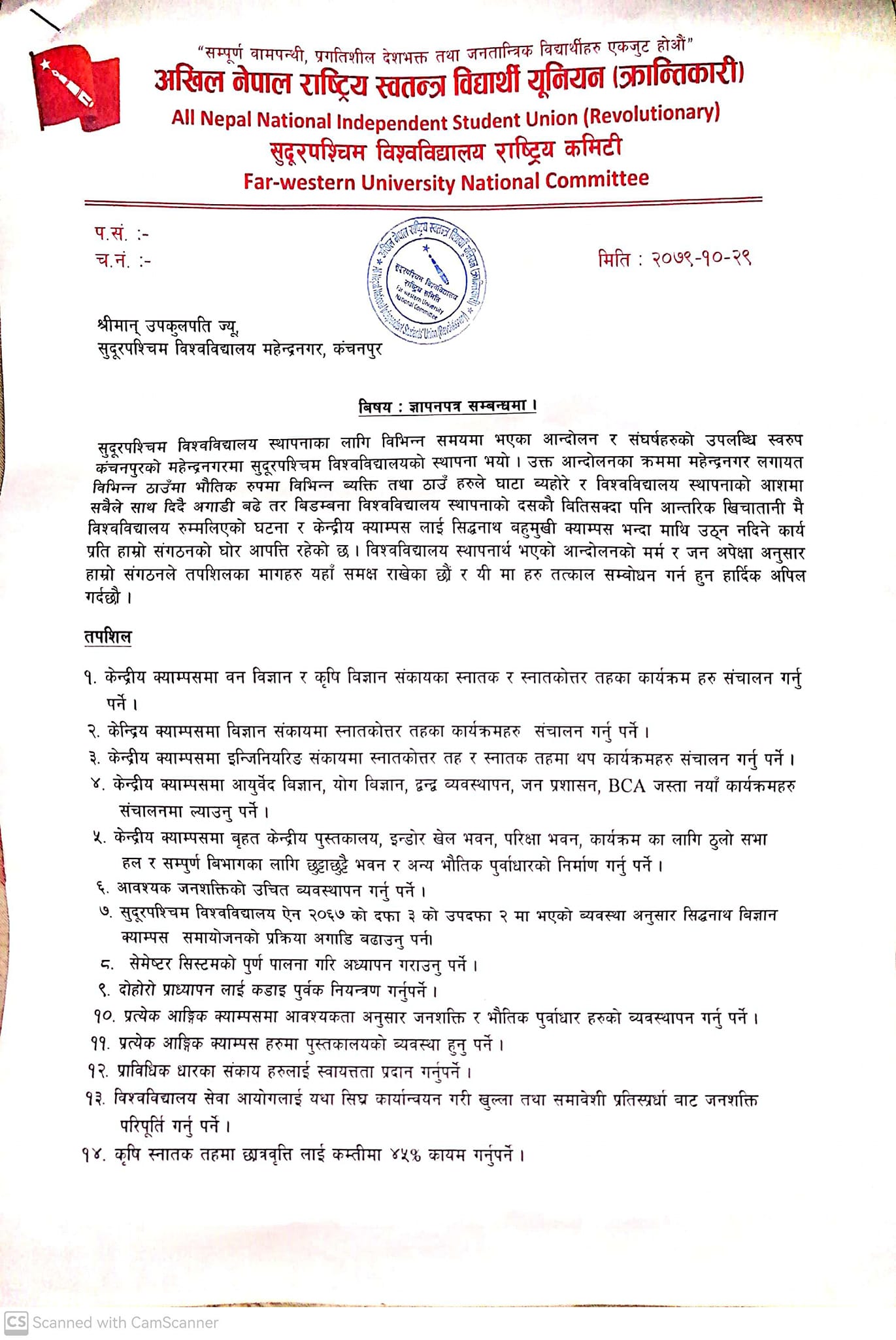 काठमाडाैं – अखिल नेपाल राष्ट्रिय स्वतन्त्र विद्यार्थी युनियन (क्रान्तिकारी) सुदूरपश्चिम विश्वविद्यालय राष्ट्रिय कमिटीले विश्वविद्यालयका उपकुलपतिलाई ज्ञापन पत्र बुझाएको छ । विभिन्न १७ बुदाका माग सम्बाेधन गर्न चेतावनी सहित आइतबार अध्यक्ष गणेशराज मिश्रले उपकुलपतिलाई ज्ञापनपत्र बुझाएको हो । विश्वविद्यालय स्थापनाको दशकौ बितिसक्दा पनि आन्तरिक खिचातानी मै विश्वविद्यालय रुम्मलिएको घटना र केन्द्रीय क्याम्पसलाई सिद्धनाथ बहुमुखी क्याम्पस भन्दा माथि उठ्न नदिने कार्य प्रति संगठनको घोर आपत्ति रहेको विज्ञप्तीमा उल्लेख गरिएको छ ।