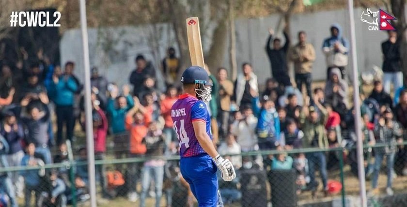नेपाललाई जिताउन शतकीयो योगदान गरेका कुशल भुर्तेल ११५ रनमा आउट भए ।