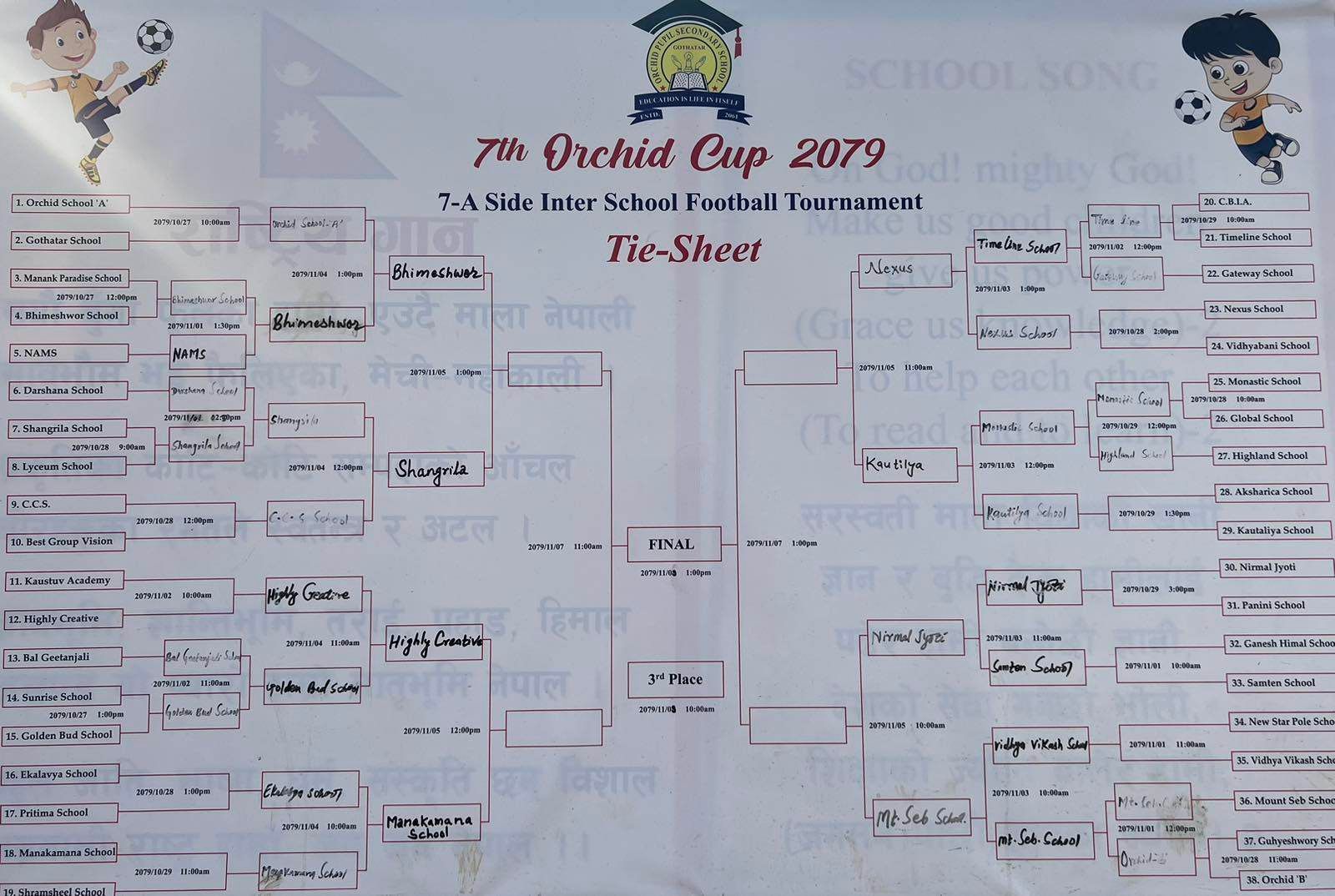 क्वाटर फाईनलका खेल भोलि हुनेछन् । जसमा पहिलो खेल भिमेश्वर स्कुल र सांग्रीला स्कुलबीच हुनेछ भने दोस्रो खेल हाईली क्रेटिभ स्कुल र मनकामना स्कुलबीच हुनेछ । यस्तै तेस्रो खेल नेक्सस स्कुल र कौटिल्य स्कुल बीच हुनेछ भने चौथो खेल निर्मल ज्योती स्कुल र माउण्ट सेव स्कुलबीच हुने आयोजक अर्किड स्कुलले जनाएको छ ।