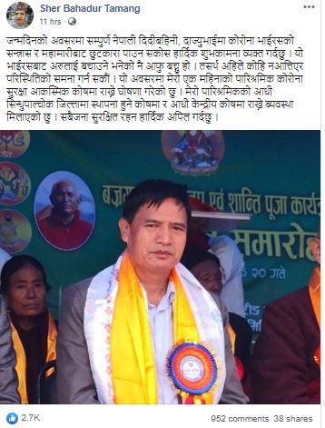 सामाजिक संजाल फेसबुक मार्फत आफ्नो एक महिनाको पारिश्रमिक आधा सिन्धुपाल्चोक जिल्लामा स्थापना हुने कोषमा र आधा केन्द्रीय कोषमा राख्ने ब्यवस्था मिलाएको छु पुर्व मन्त्री तामाङले लेखेका छन् । सिन्धुपाल्चोक जिल्लाबाट विजयी संघीय सांसद तामाङले यो विपदको समयमा सबै जना एक भएर उभिन पनि अनुरोध गरेको छ । सबै जनतालाई सुरक्षित रहन र सरकारको अनुरोध लकडाउन घर घरमा बसेर नेपाल सरकारको सहयोग गर्न समेत अपिल गरेको छ ।