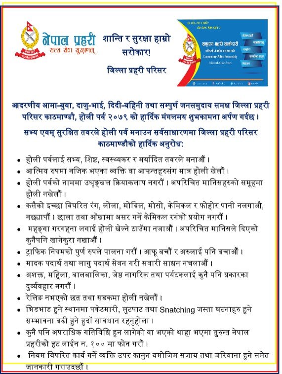 नेपाल प्रहरीको अनुरोध पत्रमा लेखिएको छ, ‘कसैको इच्छा विपरित रंग, लोला, मोबिल, मोसो, केमिकल र फोहोर पानी नलगाऔ, नछ्यापौं । छाला तथा आँखामा असर गर्ने केमिकल रगंको प्रयोग नगरौं ।’ यसवर्षको होली काठमाडौं उपत्यकासहित पहाडी जिल्लामा सोमबार र तराई मधेशका जिल्लामा मंगलबार मनाइँदै छ ।