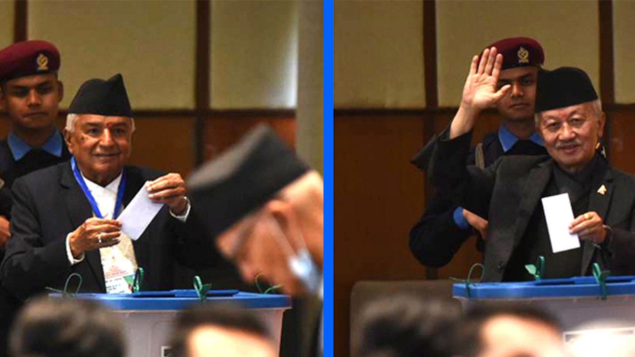 काठमाडौँ – बानेश्वरस्थित सङ्घीय संसद् भवनको ल्होत्से हलमा राष्ट्रपति निर्वाचनको मतदान सुरु भएको छ । बिहान १० बजेदेखि राष्ट्रपति निर्वाचनको मतदान सुरु भएको र राष्ट्रपतिका उम्मेदवार पूर्व सभामुख एवम् नेपाली कांग्रेसका वरिष्ठ नेता रामचन्द्र पौडेलले पहिलो मत खसाल्नुभएको छ । पूर्व सभामुख एवम् नेकपा (एमाले) का उपाध्यक्ष सुवासचन्द्र नेम्वाङले पनि मत खसाल्नुभएको छ । पौडेल नौ दलीय गठबन्धनका तर्फबाट साझा उम्मेदवार हुनुहुन्छ भने, नेम्वाङले एमालेका तर्फबाट एकल उम्मेदवार दिनुभएको हो ।