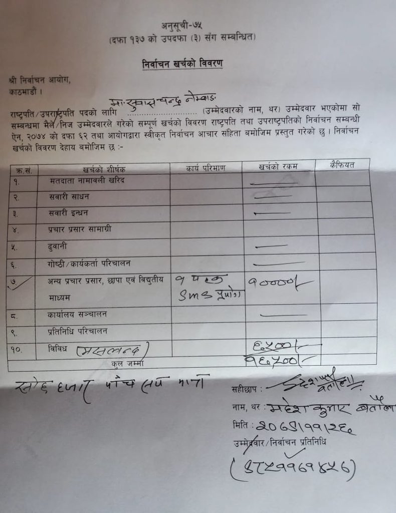 काठमाडाैं – एमालेका तर्फबाट राष्ट्रपतिको उम्मेदवार बनेका एमाले उपाध्यक्ष सुवास नेम्वाङले राष्ट्रपति निर्वाचनमा भएको खर्च सार्वजनिक गरेका छन्। राष्ट्रपतिको उम्मेदवार बन्दा १६ हजार ५ सय रुपैयाँ खर्च भएको विवरण नेम्वाङले निर्वाचन आयोगलाई बुझाएका छन्।