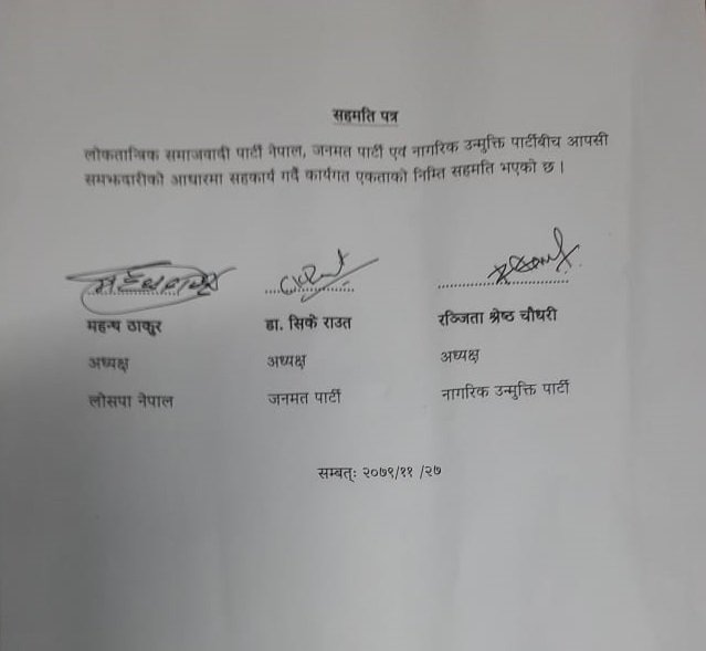 काठमाडौँ – जनमत पार्टी, लोकतान्त्रिक समाजवादी पार्टी नेपाल र नागरिक उन्मुक्ति पार्टीबीच कार्यगत एकताको सहमति भएको छ।शनिबार तीन दलबीच विभिन्न एजेन्डाहरूमा सहकार्य गरी अगाडि बढ्ने निर्णय भएको जनमत पार्टीका अध्यक्ष सिके राउतले सामाजिक सञ्जालमार्फत जानकारी दिएका छन्। ‘तीन पार्टीबीच आपसी समझदारीको आधारमा सहकार्य गर्दै कार्यगत एकताको निम्ति सहमति भएको छ,’ सहमति पत्रमा उल्लेख छ।