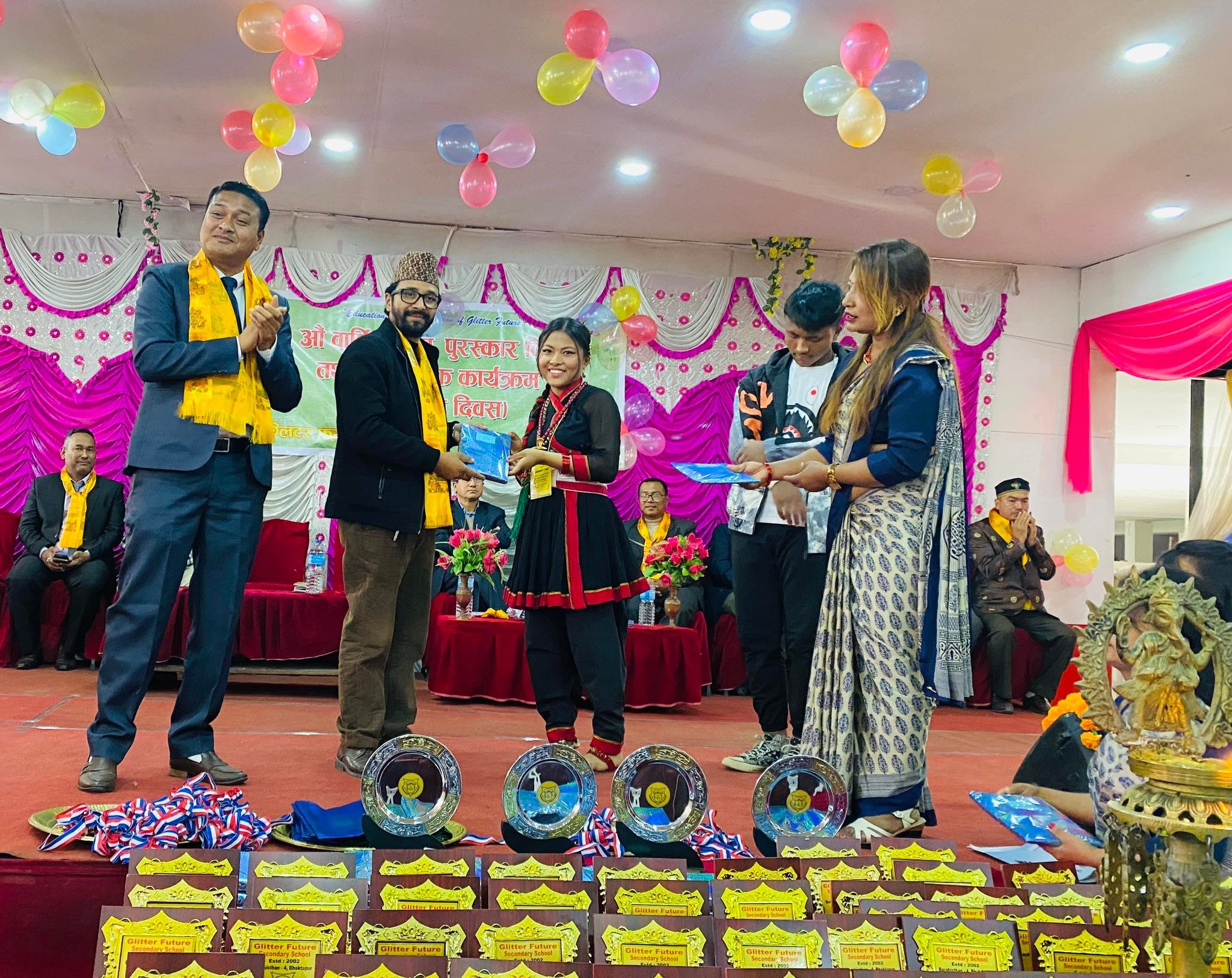 गुणस्तरीय शिक्षा प्रदान गर्दै आएको ग्लिटर फ्युचर स्कुल यस भक्तपुर नगरपालिकाको एक अब्बल र उत्कृष्ट निजी स्कुलको रुपमा अभिभावक एवं विद्यार्थीको विश्वास जित्न र शैक्षिक उन्नयनमा उत्तरदायी छाप छोड्न अग्रसर देखिएको चर्चा गर्दै आगामि वर्षदेखि थप आकर्षक शैक्षिक कार्यक्रमहरु संचालनमा ल्याउने ग्लिटर फ्युचर स्कुलमा अभिभावकहरुले आफ्ना बालबालिकाहरु भर्ना गरी लाभान्वित हुन शुभेच्छा प्रदान गर्नु भएको थियो । एसईई वर्ष २०७५ देखि २०७८ मा उत्तीर्ण हुने पूर्व विद्यार्थीहरुलाई मायाको चिनो प्रदान गरी सम्मान र कक्षागत शैक्षिक पुरस्कारका साथै अनिवार्य क्रियाकलापमा विजेता विद्यार्थीहरुलाई पुरस्कार तथा मेडल प्रदान गरिएको उक्त कार्यक्रममा विद्यालयका संचालक/प्रिन्सिपल राम प्रसाद खाताखोले विद्यालयको गतिविधि प्रष्ट्याउदै अभिभावक तथा विद्यार्थीहरुलाई सहजता प्रदान गर्न स्कुल बस र दिवा खाजाको व्यवस्था गरिएको बताउनु भयो ! प्रिन्सिपल खाताखोले ग्लिटर फ्युचरमा “एक विद्यार्थी एक खेल” अभियान सुरु गरेको समेत उल्लेख गर्नु भयो ! विद्यार्थीहरुको विविध साँस्कृतिक प्रस्तुति, प्रतिभा प्रस्फुटन र खेल प्रस्तुतिहरु राखिएको सो कार्यक्रममा अतिथिहरु नेशनल प्याव्सन भक्तपुरका कोषाध्यक्ष दिनेश शाक्य, विनोद लामा, श्रीराम सुवाल लगाएतको उपस्थिति रहेको थियो ।