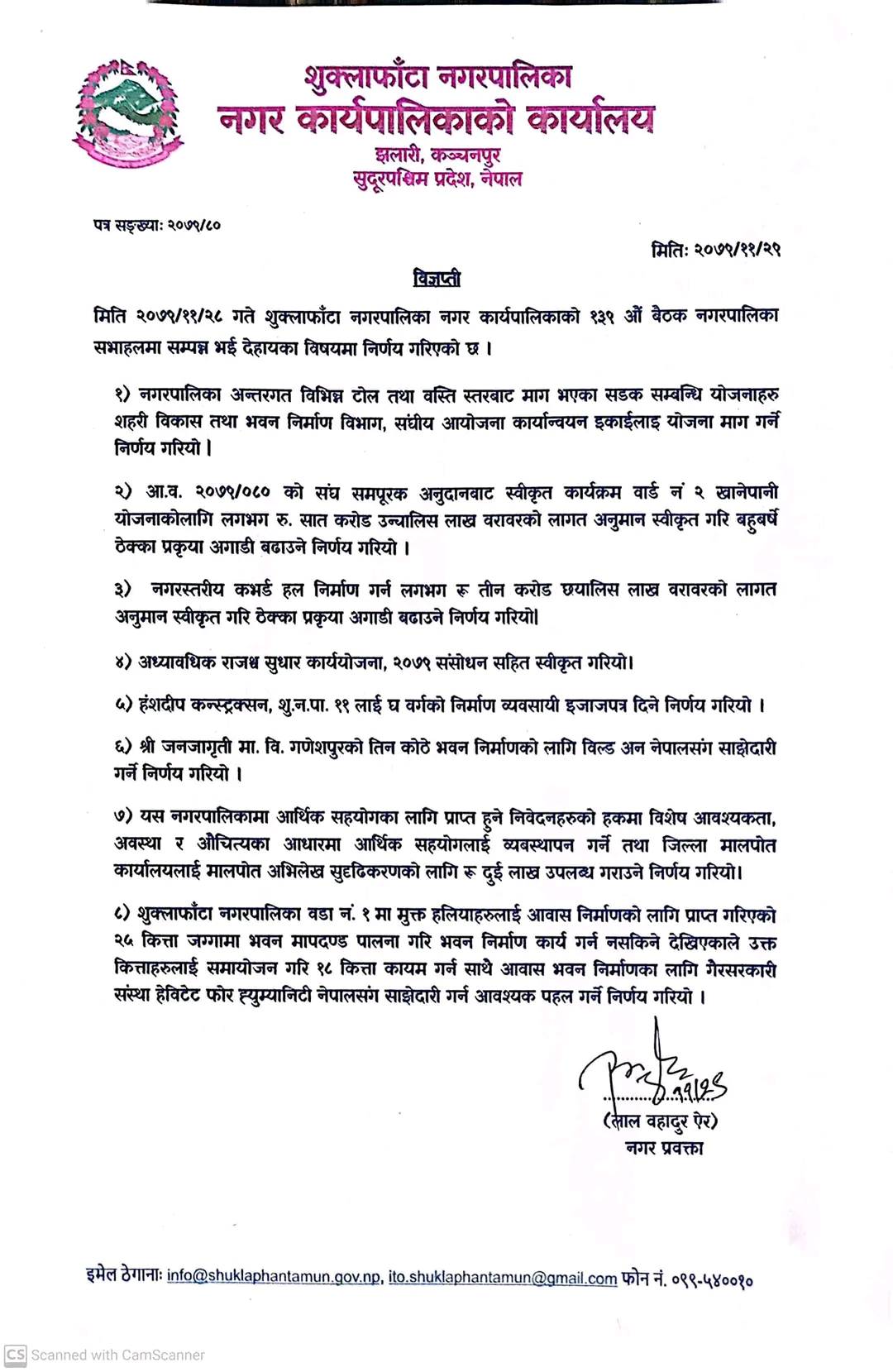 शुक्लाफाँटा नगरपालिकाको आइतबार बसेको नगर कार्य पालिकाको १३९ औँ बैठकले खानेपानी र कभर्ड हल निर्माणका लागि ठेक्का खोल्ने निर्णय गरेको हो।