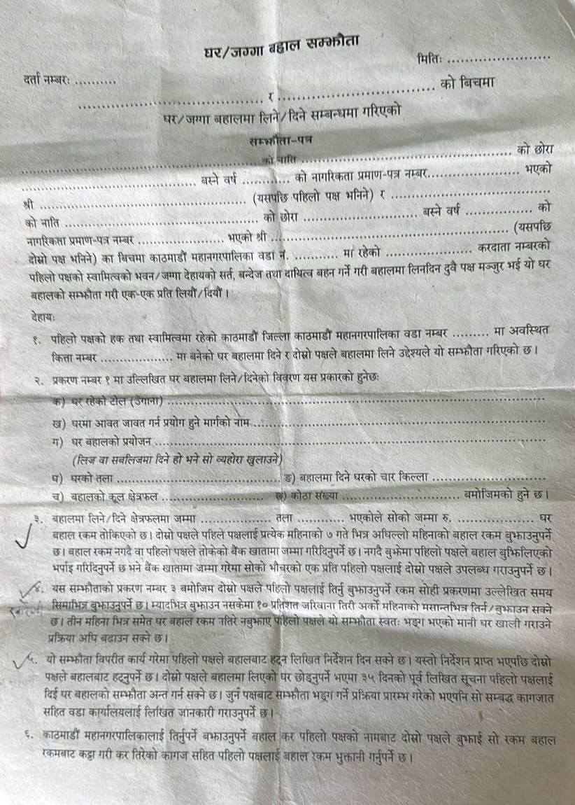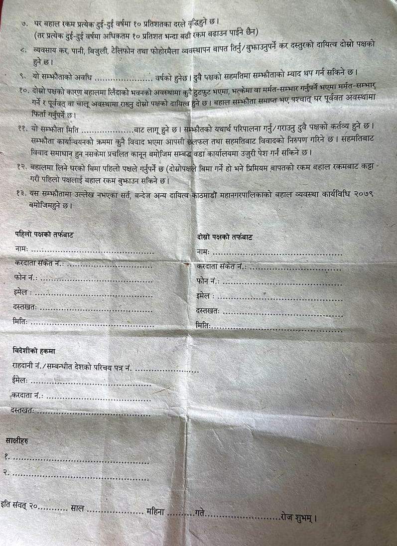 काठमाडौँ महानगरपालिका तिर्नुपर्ने बुझाउनुपर्ने बहाल कर पहिलो पक्षको नामबाट दोस्रो पक्षले बुझाई सो रकम बहाल रकमबाट कट्टा गरी कर तिरको कागज सहित पहिलो पक्षलाई बहाल रकम भुक्तानी गर्नुपर्नेछ भनिएको छ भने घर बहाल रकम प्रत्येक दुई–दुई बर्षमा १० प्रतिशतका दरले बृदि हुने छ भनिएको छ । यस्तै व्यवसाय कर, पानी, बिजुली, टेलिफोन तथा फोहरमैला व्यवस्थापन वापत तिर्नु/बुझाउनुपर्ने कर दस्तुरको दायित्व दोस्रो पक्षको हुनेछ भनिएको छ । यो कुरा निरन्तर रुपमा लागु भइ नै रहेकोले बुदा नं. ३, ४ र ५ बाहेकका सबै बुदाहरु ठिकै भएको समेत उहाँले बताउनुभयो ।