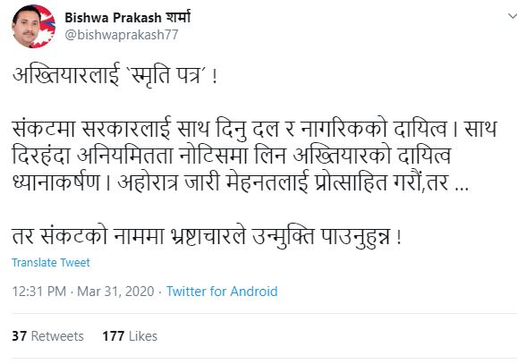 ‘अख्तियारलाई ‘स्मृति पत्र’ संकटमा सरकारलाई साथ दिनु दल र नागरिकको दायित्व । साथ दिरहँदा अनियमितता नोटिसमा लिन अख्तियारको दायित्व ध्यानाकर्षण । अहोरात्र जारी मेहनतलाई प्रोत्साहित गरौं, तर, संकटको नाममा भ्रष्टाचारले उन्मुक्ति पाउनुहुन्न’, सामाजिक सञ्जाल ट्विटरमा प्रवक्ता शर्माले लेखेका छन् ।